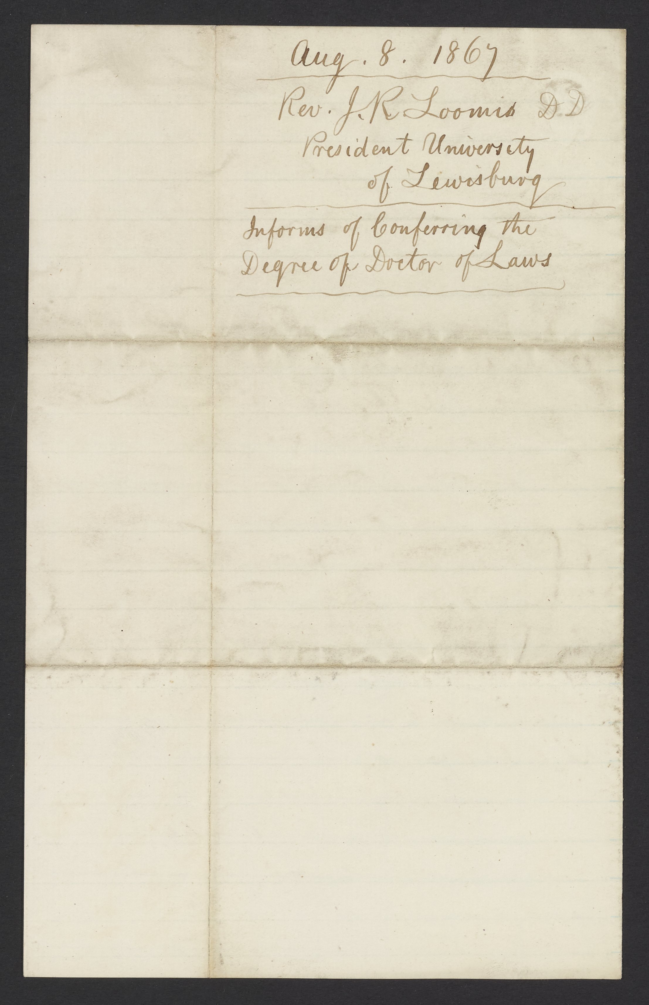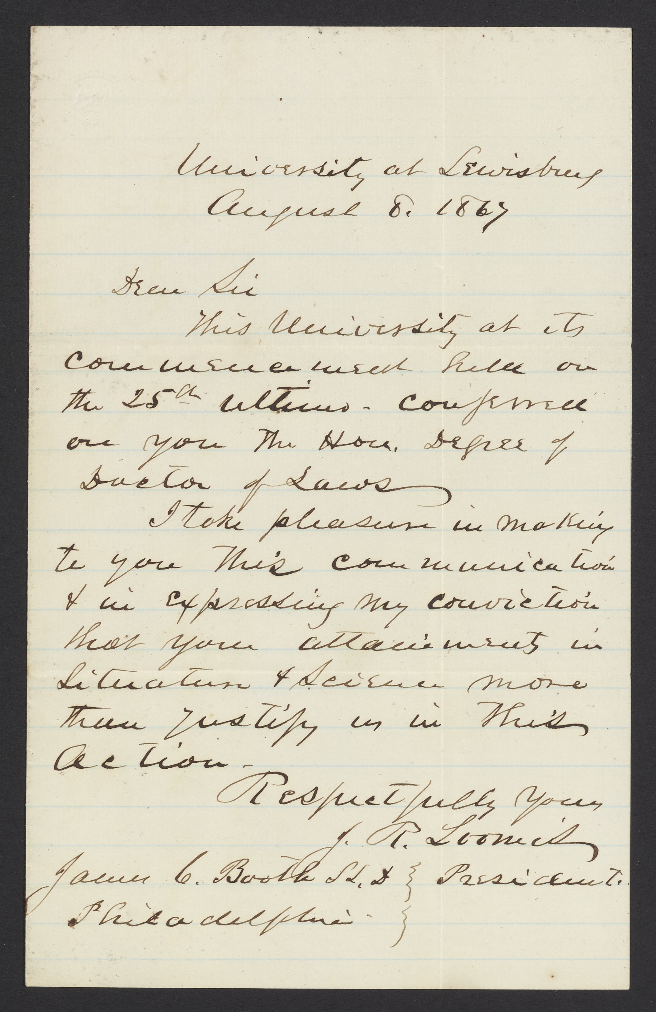 Small JPG1200 x 1850px — 283 KBFull-sized JPG2214 x 3414px — 799 KBOriginal fileTIFF — 2214 x 3414px — 21.7 MBJustin Rolph Loomis (1810-1898), president of the University of Lewisburg (now Bucknell University), writes to confer a Doctor of Law degree upon James Curtis Booth (1810-1888).