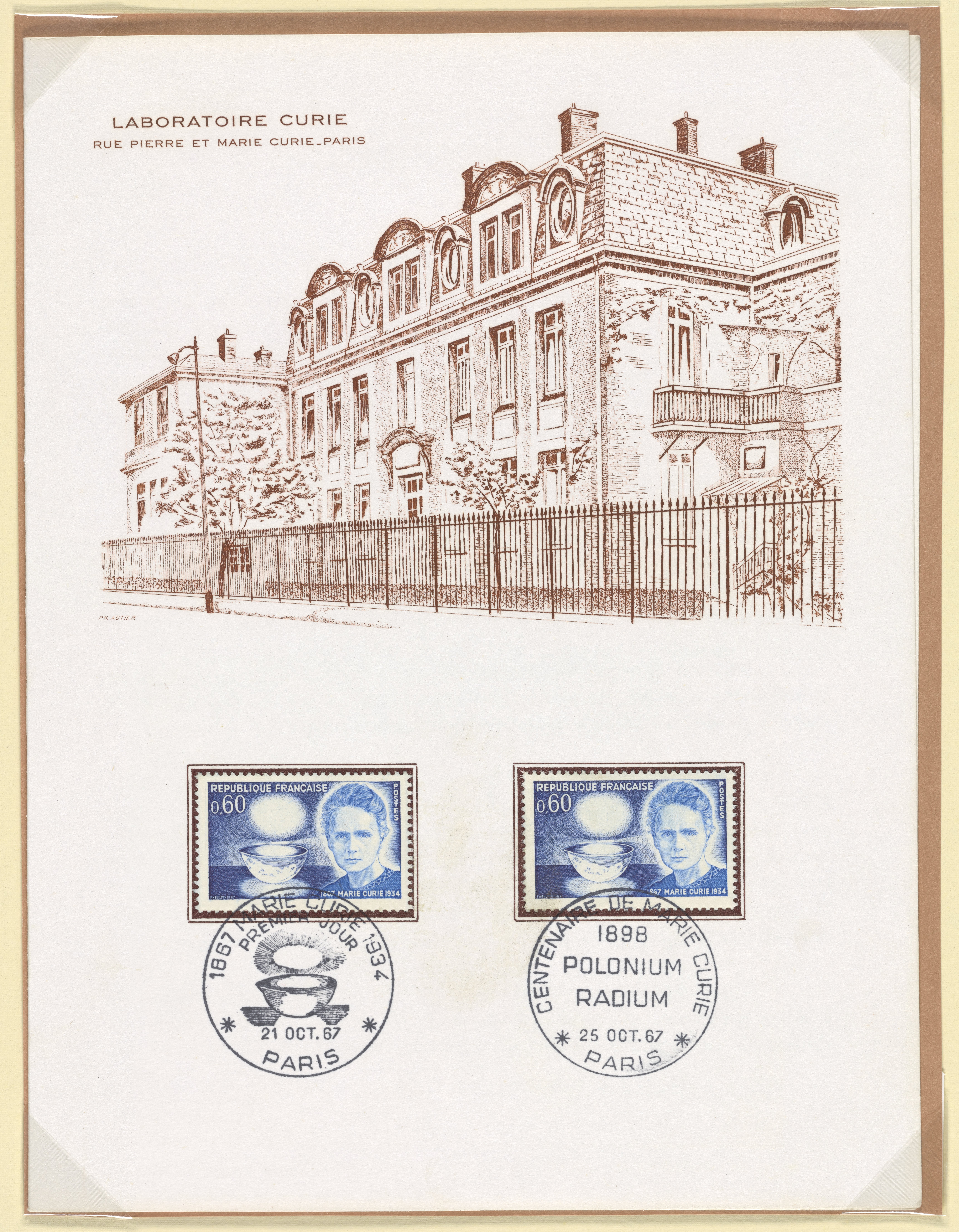 Autier, Ph., and Jean Pheulpin. “Postcard with French Postal Stamps Commemorating the Centenary of the Birth of Marie Curie.” France, 1967. Witco Stamp Collection, Box 2. Science History Institute. Philadelphia. https://digital.sciencehistory.org/works/3197xm259.