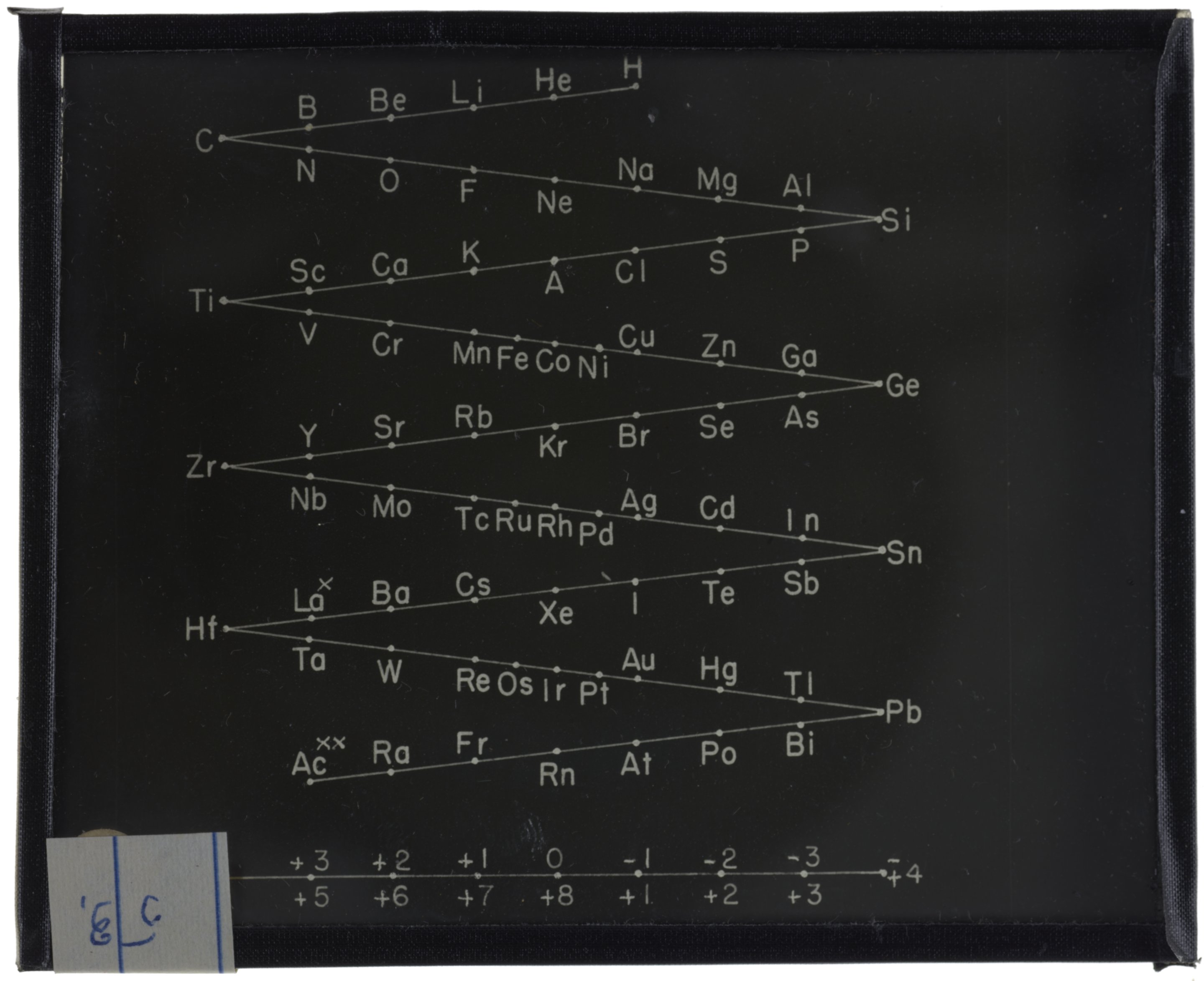 Reynolds, James Emerson, and Edward G. Mazurs. “Periodic Table in the Style of a Zigzag (James Emerson Reynolds, 1886).” Glass (material), circa 1886–1957. Edward G. Mazurs Collection of Periodic Systems Images, Box 1. Science History Institute. Philadelphia. https://digital.sciencehistory.org/works/3197xm60w.