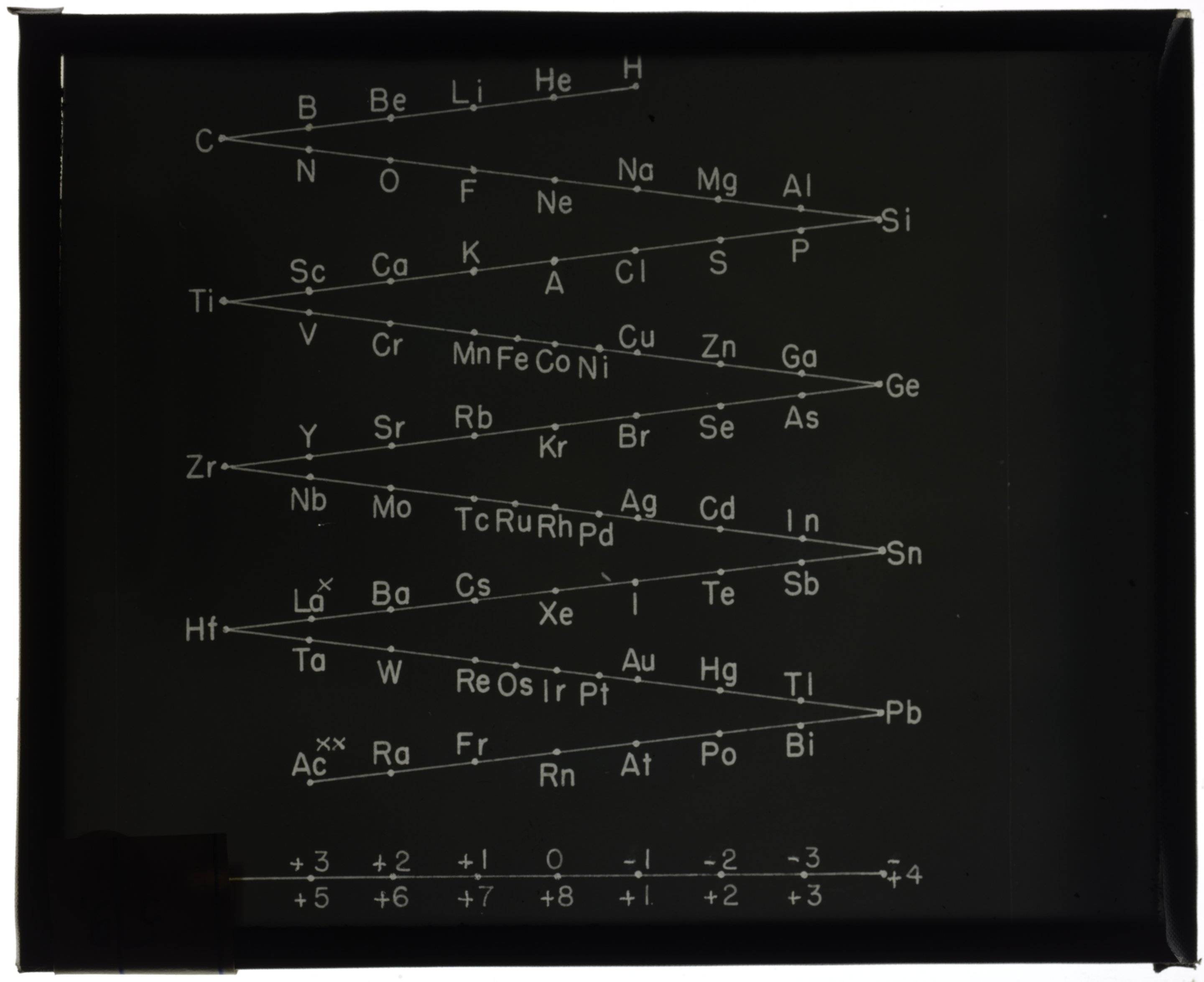 Reynolds, James Emerson, and Edward G. Mazurs. “Periodic Table in the Style of a Zigzag (James Emerson Reynolds, 1886).” Glass (material), circa 1886–1957. Edward G. Mazurs Collection of Periodic Systems Images, Box 1. Science History Institute. Philadelphia. https://digital.sciencehistory.org/works/3197xm60w.