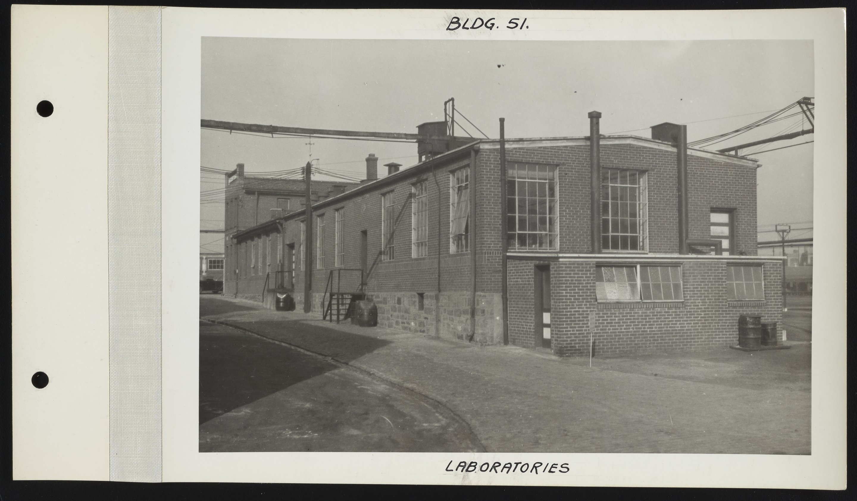 General view of the exterior of the laboratory facilities (Building 51) at the Charles Lennig and Company chemical manufacturing plant in Bridesburg, a neighborhood located along the Delaware River in the Northeast section of Philadelphia, Pennsylvania. Charles Lennig and Company operated as a subsidiary of the Rohm and Haas Company, an international chemical company headquartered in Philadelphia, from 1920 to 1947.