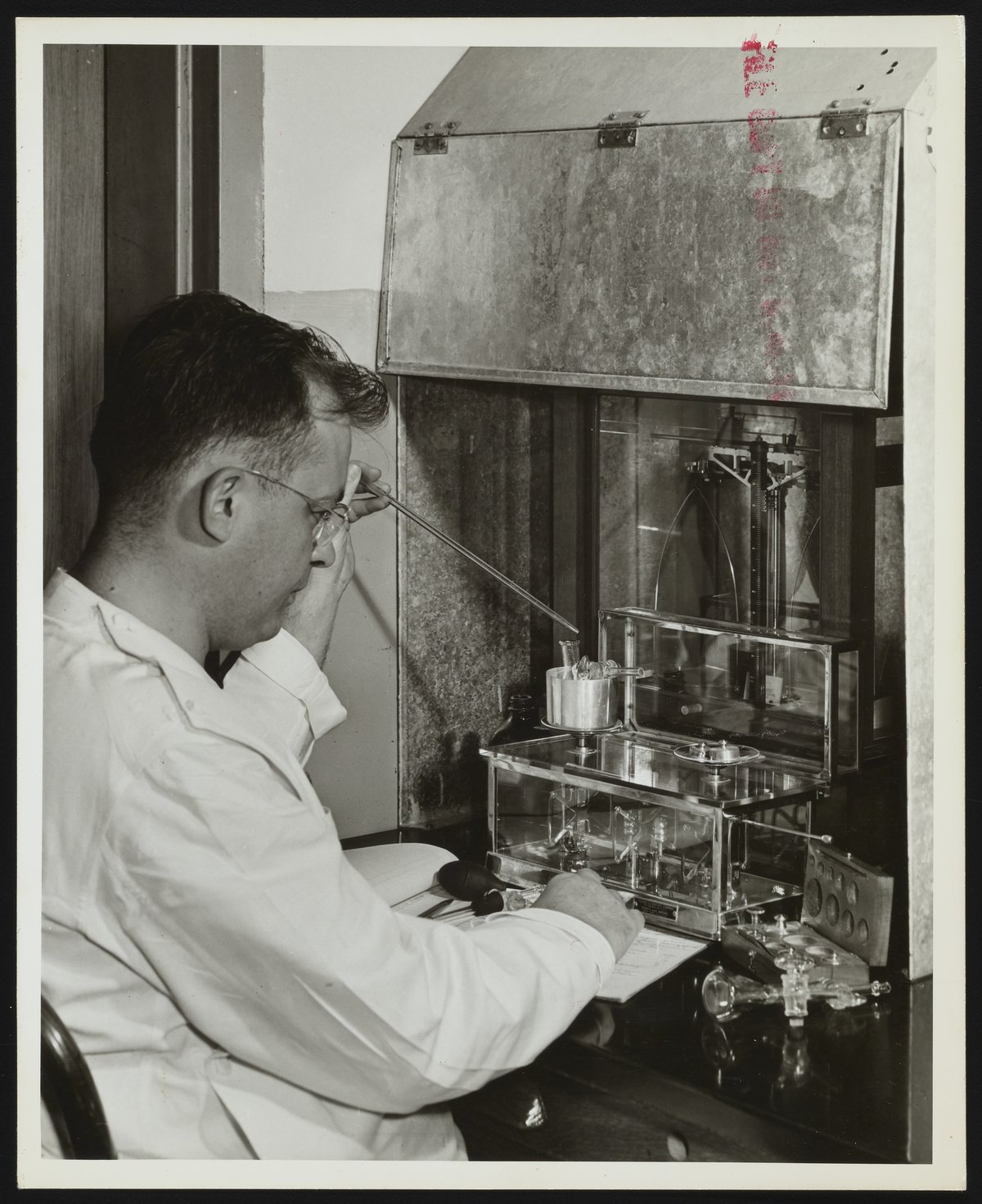 General view of an unidentified employee measuring the specific gravity of a specimen in the Dow Chemical Company's Agricultural Chemical Research and Development Laboratory. Per an article in the August 1941 edition of the Dow Diamond , the department was responsible for studying the diseases of living plants, the effects of parasites, and the study and testing of insecticides, fungicides, and fumigants.