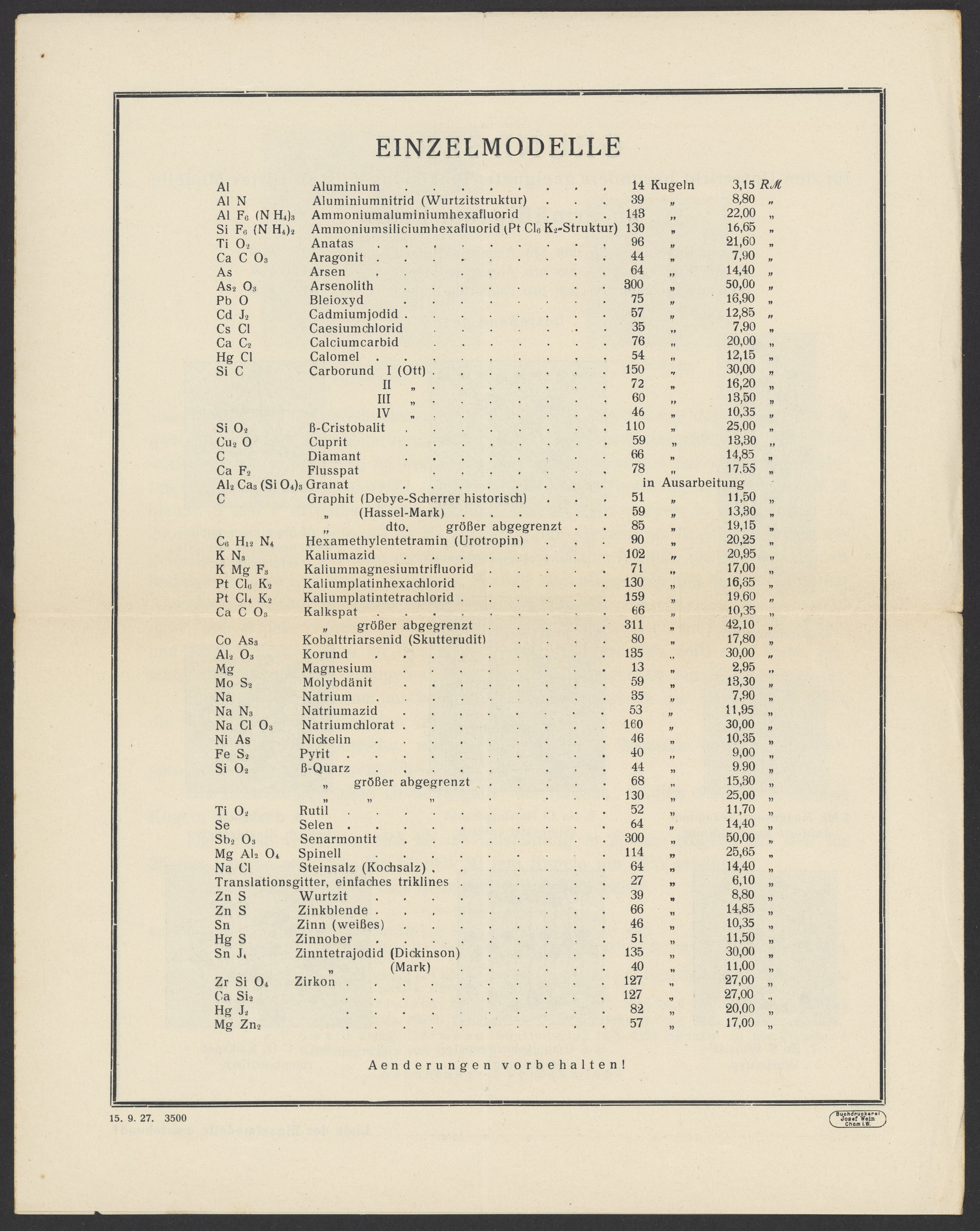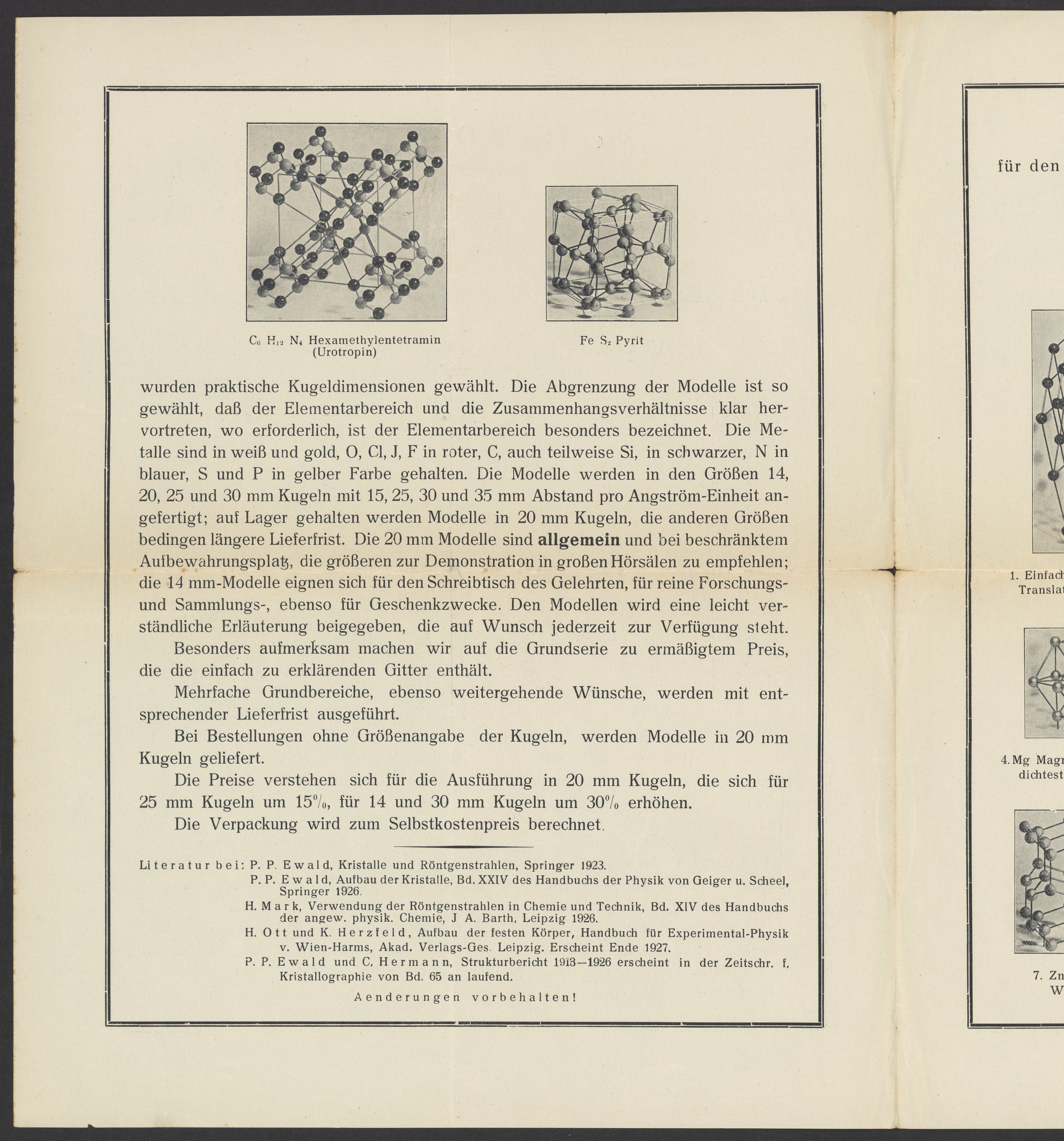 Kristall-Struktur. “Präzisions Kristall Gitter Modelle Fur Lehr- Und Forschungszwecke.” Josef Wein, circa 1925. Papers of Georg and Max Bredig, Box 3, Folder 3. Science History Institute. Philadelphia. https://digital.sciencehistory.org/works/31gb717.