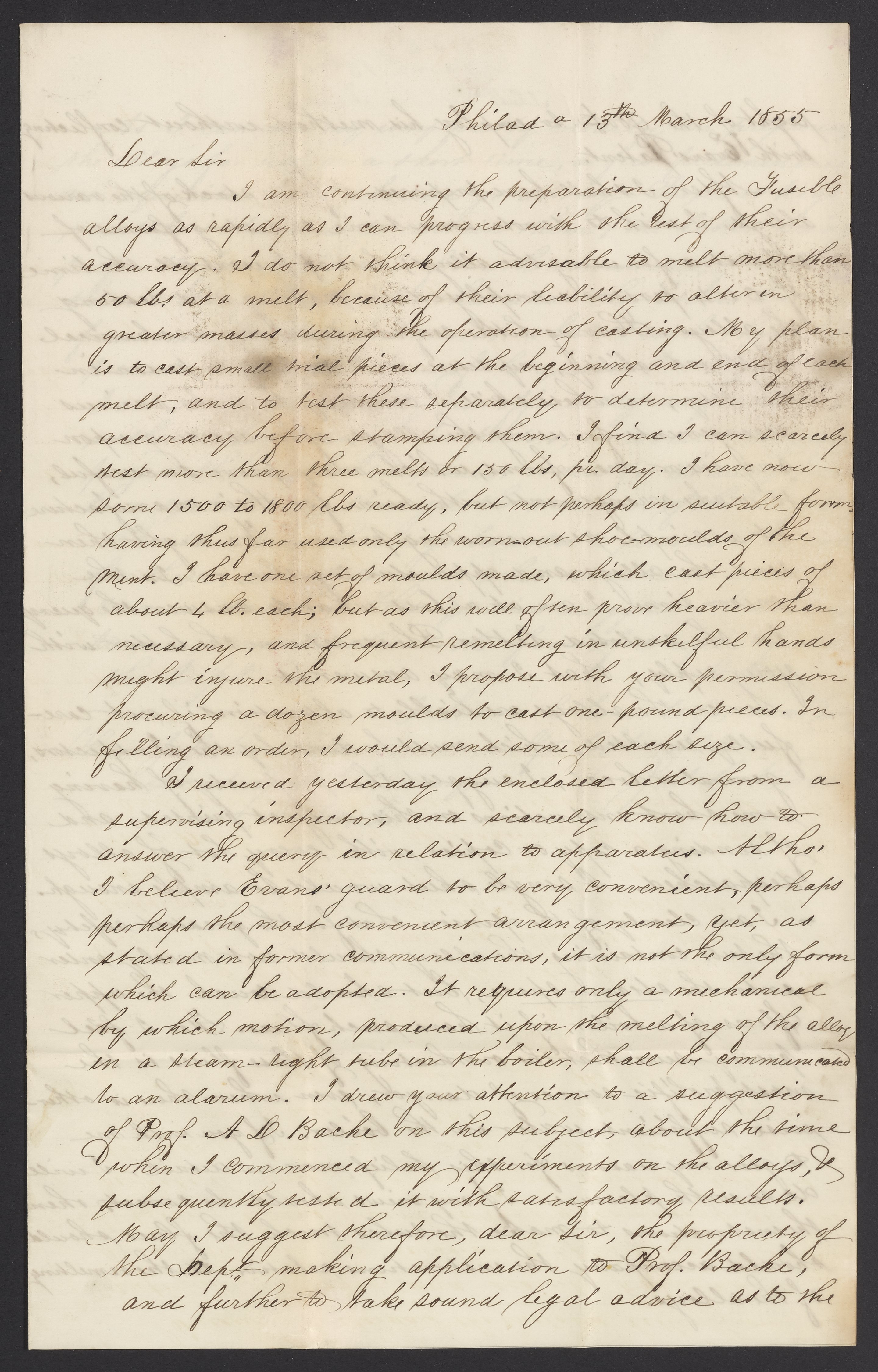 Small JPG1200 x 1875px — 424 KBLarge JPG2880 x 4500px — 1.7 MBFull-sized JPG3374 x 5272px — 2.3 MBOriginal fileTIFF — 3374 x 5272px — 50.9 MBJames Curtis Booth (1810-1888), melter and refiner of the United States Mint, writes to James Guthrie (1794-1869), Secretary of the Treasury, to discuss the production of fusible alloys.