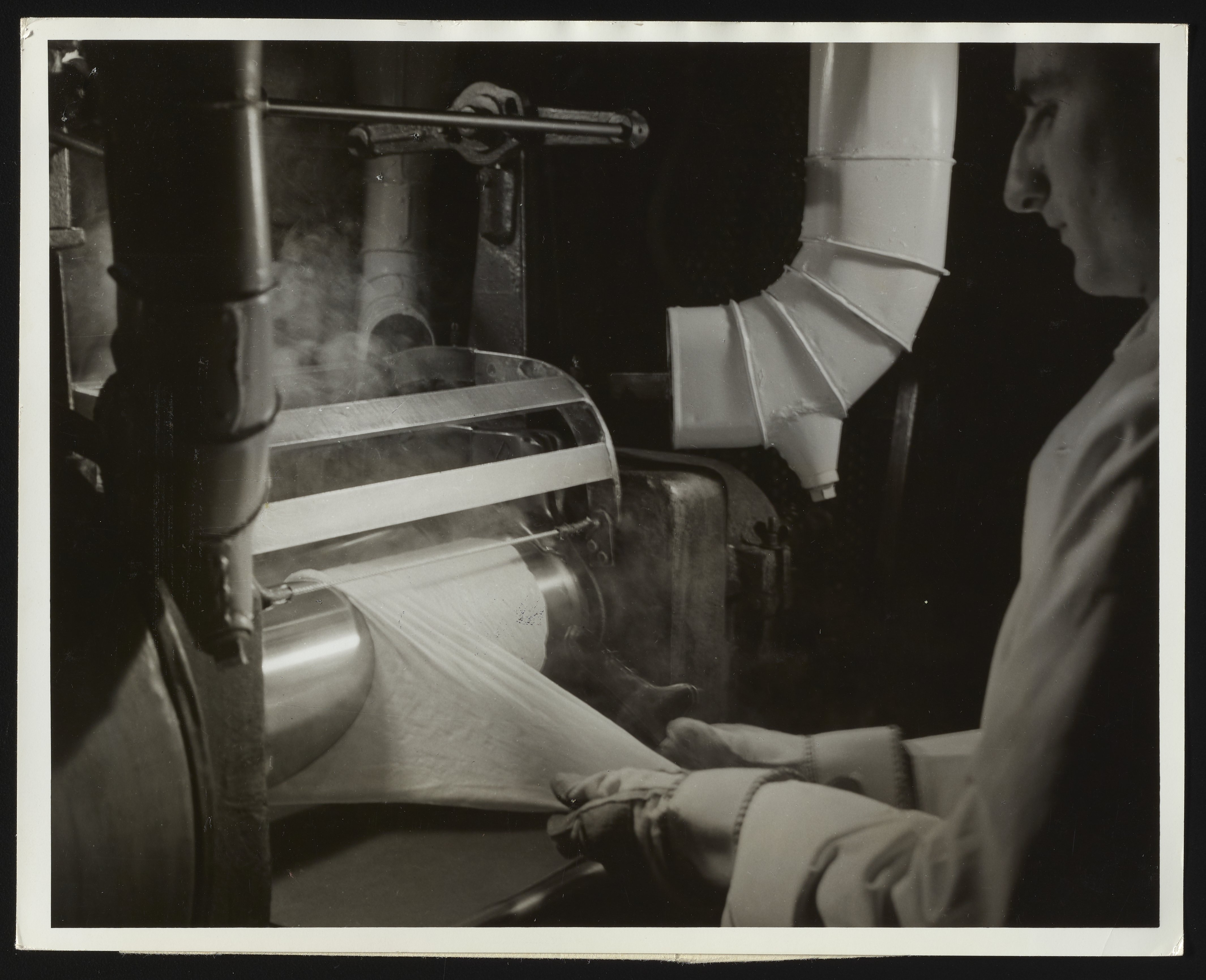 Close-up view of operator L.F. Strugala using a two-roll mill in the Plastics Laboratory at the Hercules Powder Company plant in Parlin, New Jersey. Per notations accompanying the photograph, the two-roll mill was used to blend flakes of nitrocellulose, cellulose acetate, and other materials with unspecified plasticizers to produce experimental batches of molding powders used at the plant for testing purposes, as well as small batches of plastics used for color matching. The Parlin plant commonly produced ethyl cellulose, nitrocellulose and cellulose acetate, which were purchased by a variety of public and private industries as a raw material for use in plastics, films, lacquers, and other materials.