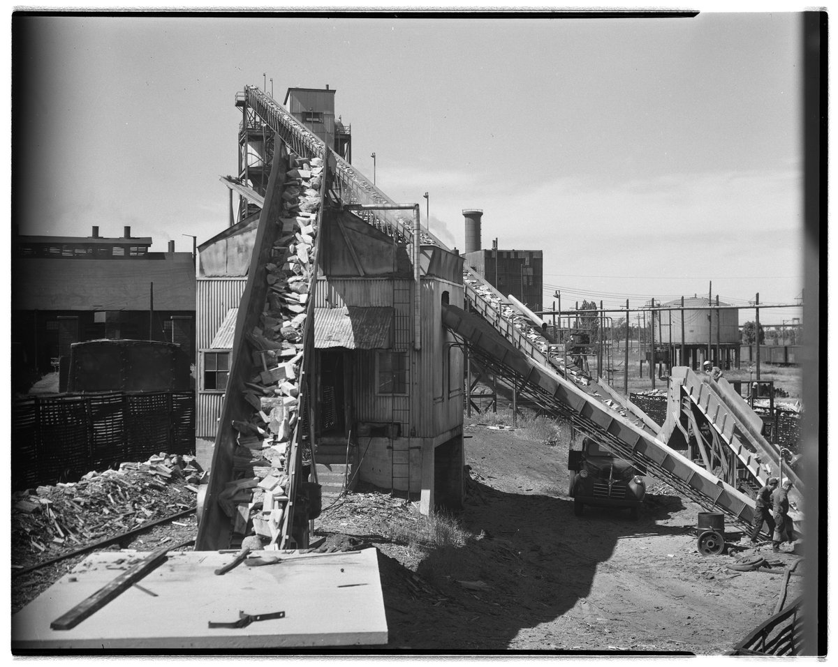 Dow Chemical Company. “Vertical Retort and Wood Loading Conveyor,” 1949. Dow Chemical Company Historical Image Collection, Box 2, Folder Places--Cliffs-Dow Chemical Company--Marquette, Mich.--Outdoor Logging Operations. Science History Institute. Philadelphia. https://digital.sciencehistory.org/works/3484zh80m.