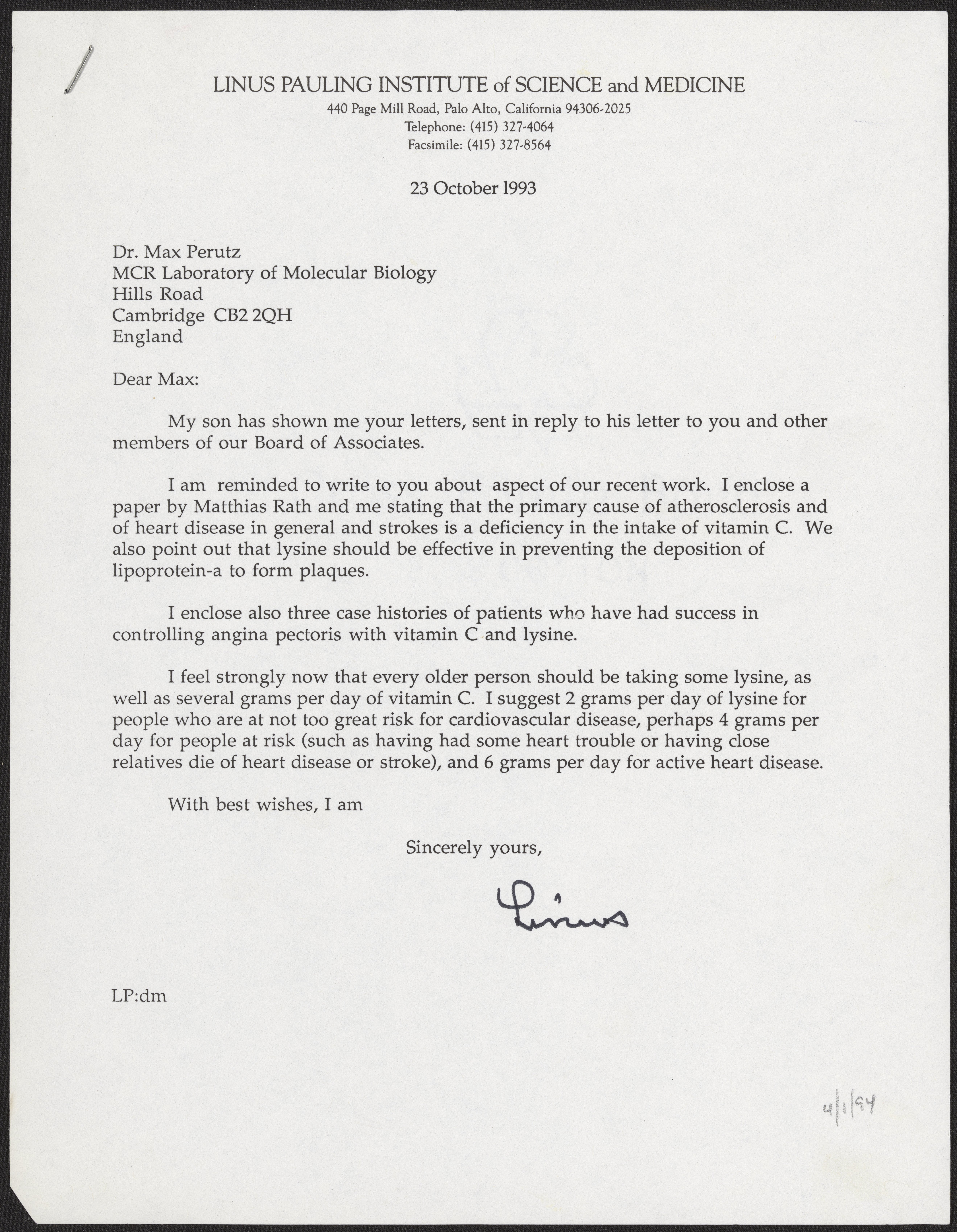 Letter from Linus Pauling to Max Perutz, October 23, 1993