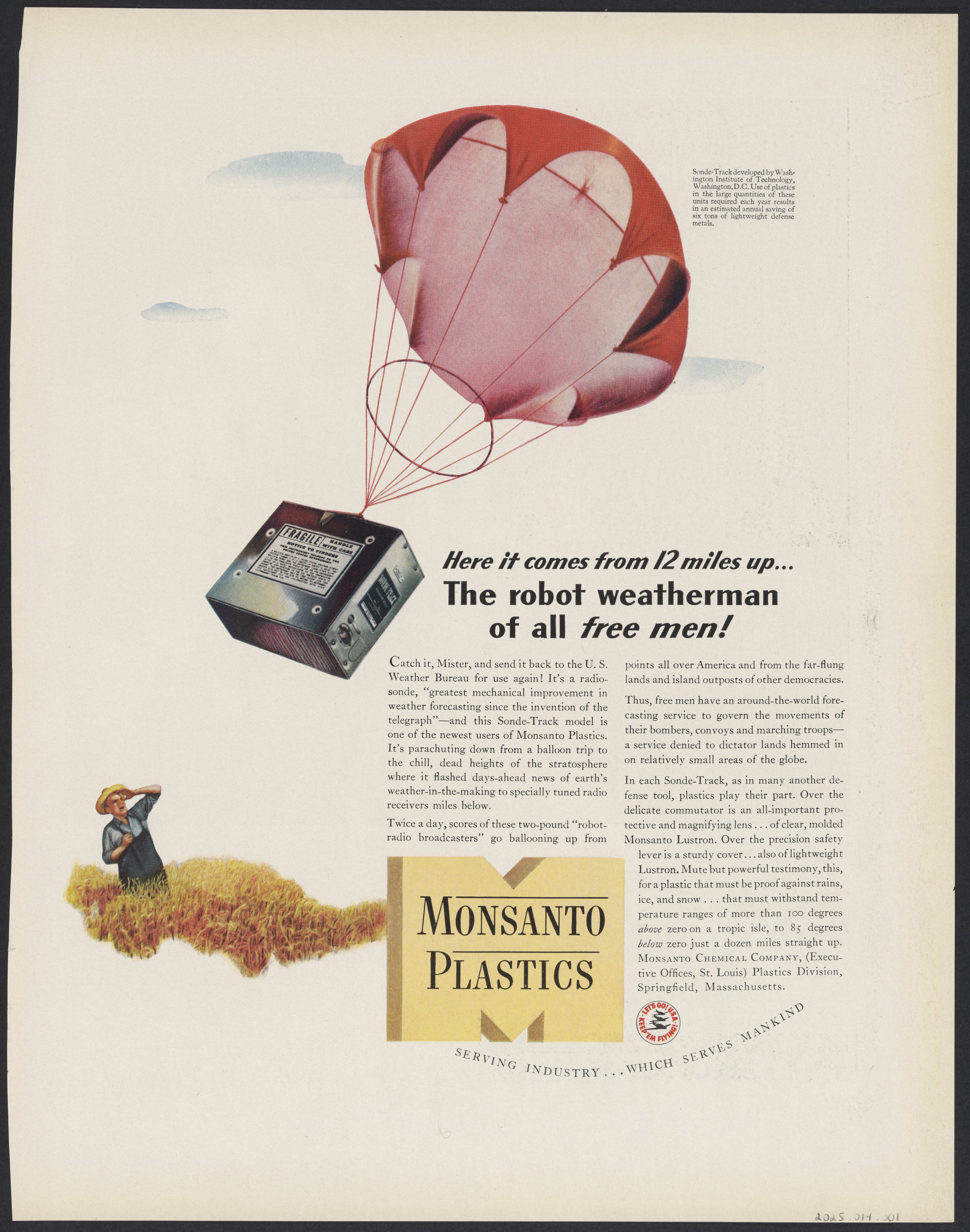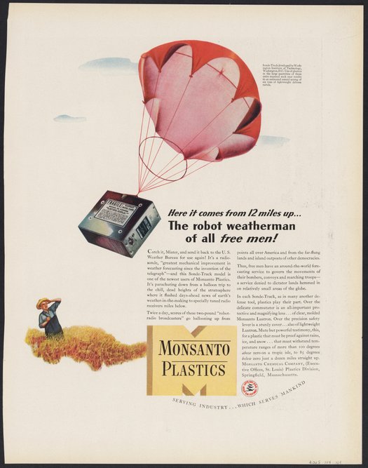 Monsanto Chemical Company. “Robot Weatherman Radiosonde Advertisement,” 1940–1949. Science History Institute. Philadelphia. https://digital.sciencehistory.org/works/352m3oi.