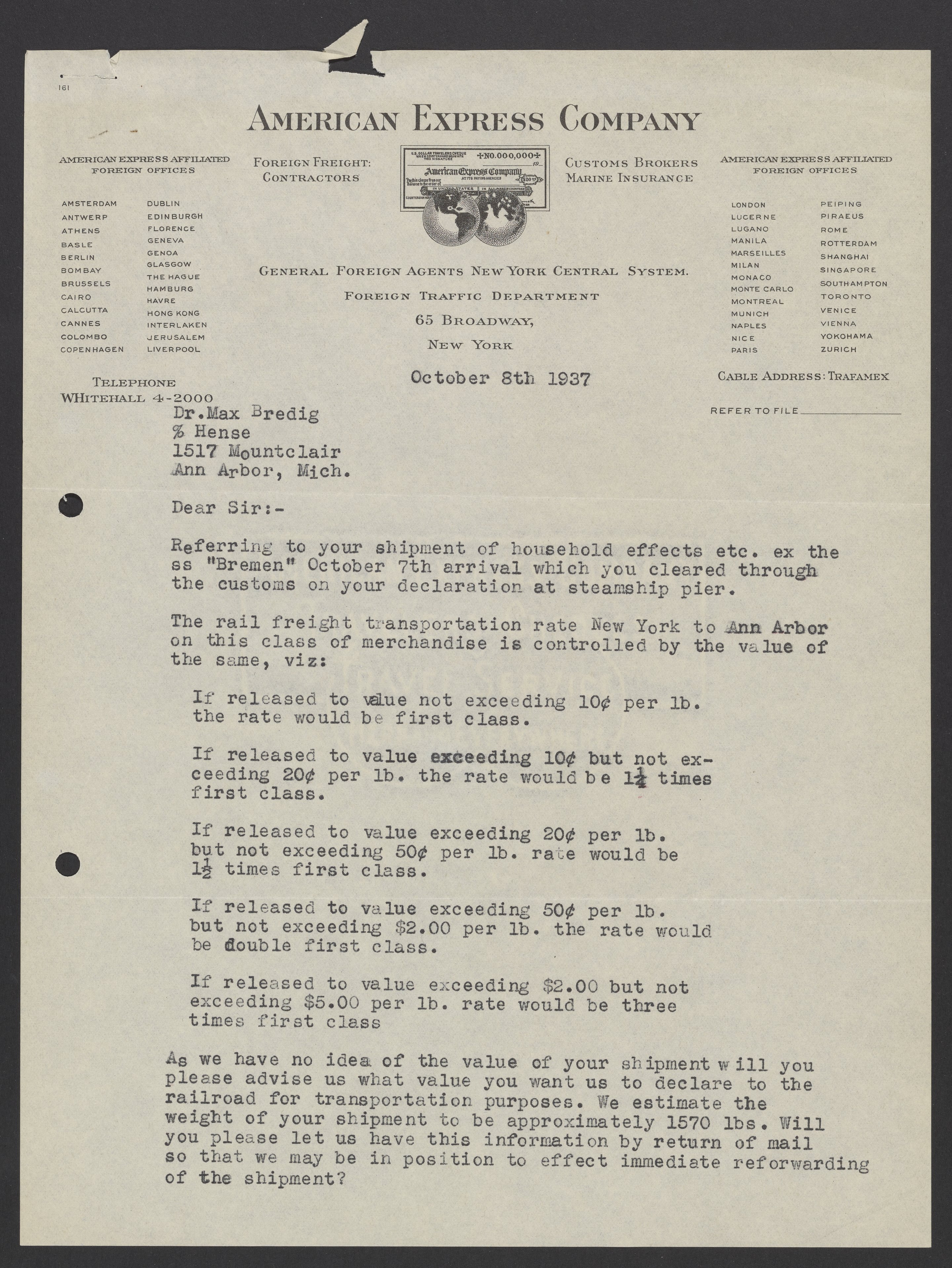 Letter from the American Express Company to Max Albert Bredig (1902-1977) about the cost and weight of a shipment from Bremen, Germany to Ann Arbor, Michigan.