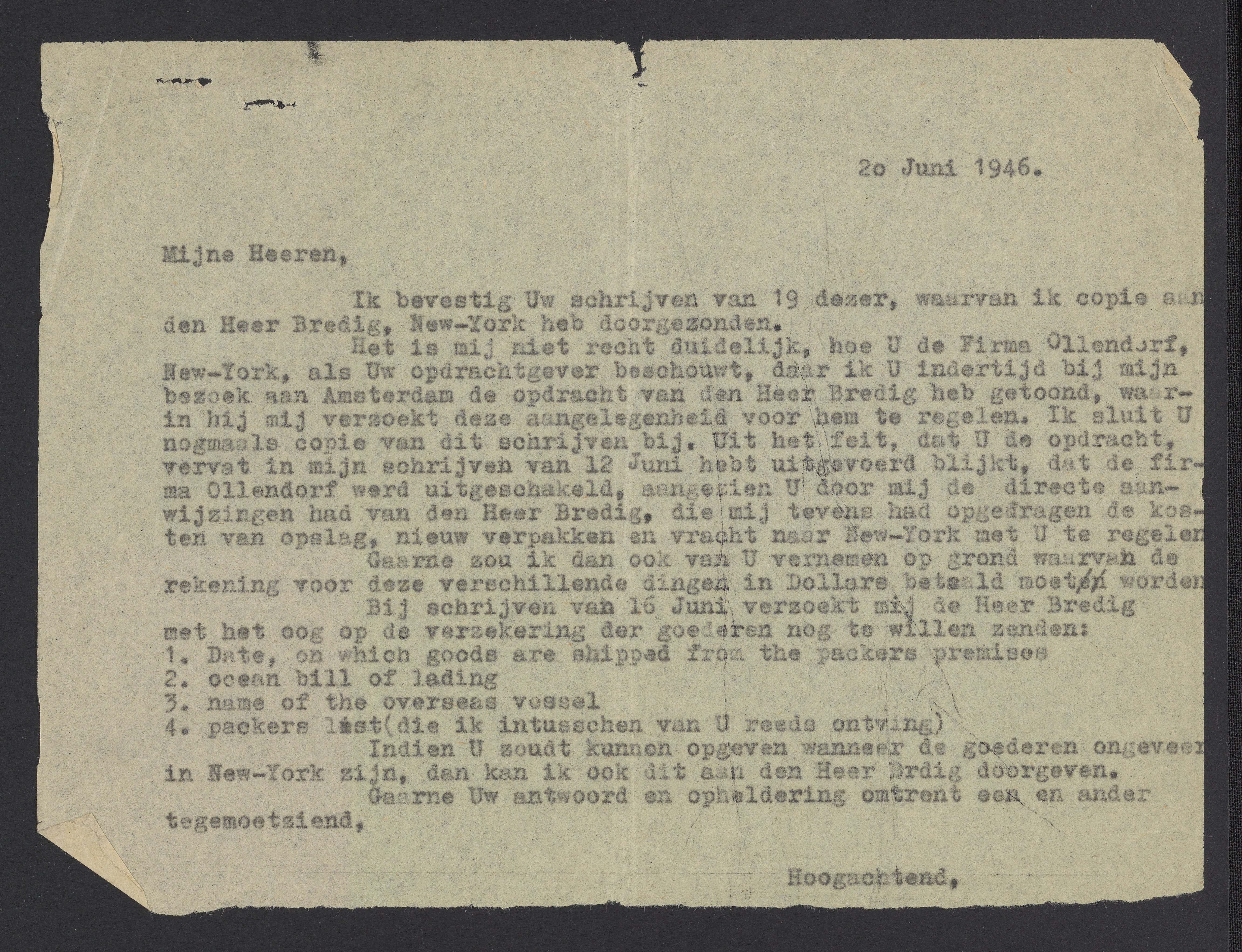 Het is mij niet recht duidelijk, hoe U de Firma Ollendorf, New-York, als Uw opdrachtgever beschouwt, daar ik U indertijd bij mijn bezoek aan Amsterdam de opdracht van den Heer Bredig heb getoond, waarin hij mij verwoekt deze aangelegenheid voor hem te regelen. Ik sluit nogmanls copie van dit schrijven bij. Uit het feit, dat U de opdracht, vervat in mijn schrijven van 12 Juni hobt uitgevoerd blijkt, dat de firma Ollendorf werd uitgeschakeld, aangezien Undeer mij de direete aanwijzingen had van den Heer Bredig, die mij tevens had opgefragen de kosten van opslag, nieuw verpakken en vracht naar New-York met Ute regelen.