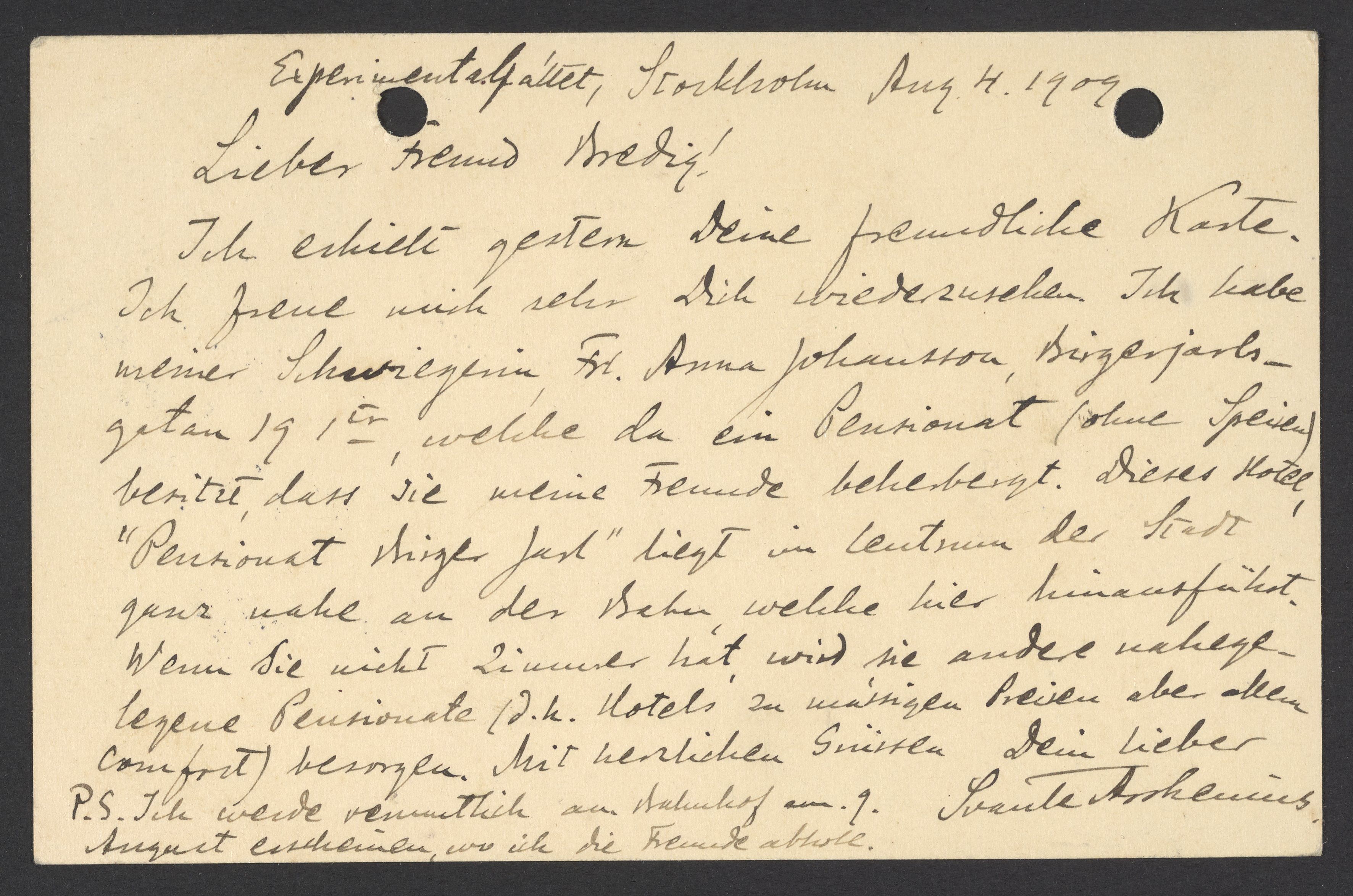Ich erhielt gestern Deine freundliche Karte. Ich freue mich sehr Dich wiederzusehen. Ich habe meiner Schwiegerin, Fr. Anna Johansson, Birger Jarlsgatan 19 1er, welche da ein Pensionat (ohne Speisen) besitzt, dass sie meine Freunde beherbergt. Dieses Hotel, "Pensionat Birger Jarl" liegt im Centrum der Stadt, ganz nahe an der Bahn, welche hier hinausfährt. Wenn sie nicht Zimmer hat, wird sie andere nahegelegene Pensionate (d.h. Hotels zu mässigen Preisen aber allem Comfort) besorgen. Mit herzlichen Grüssen