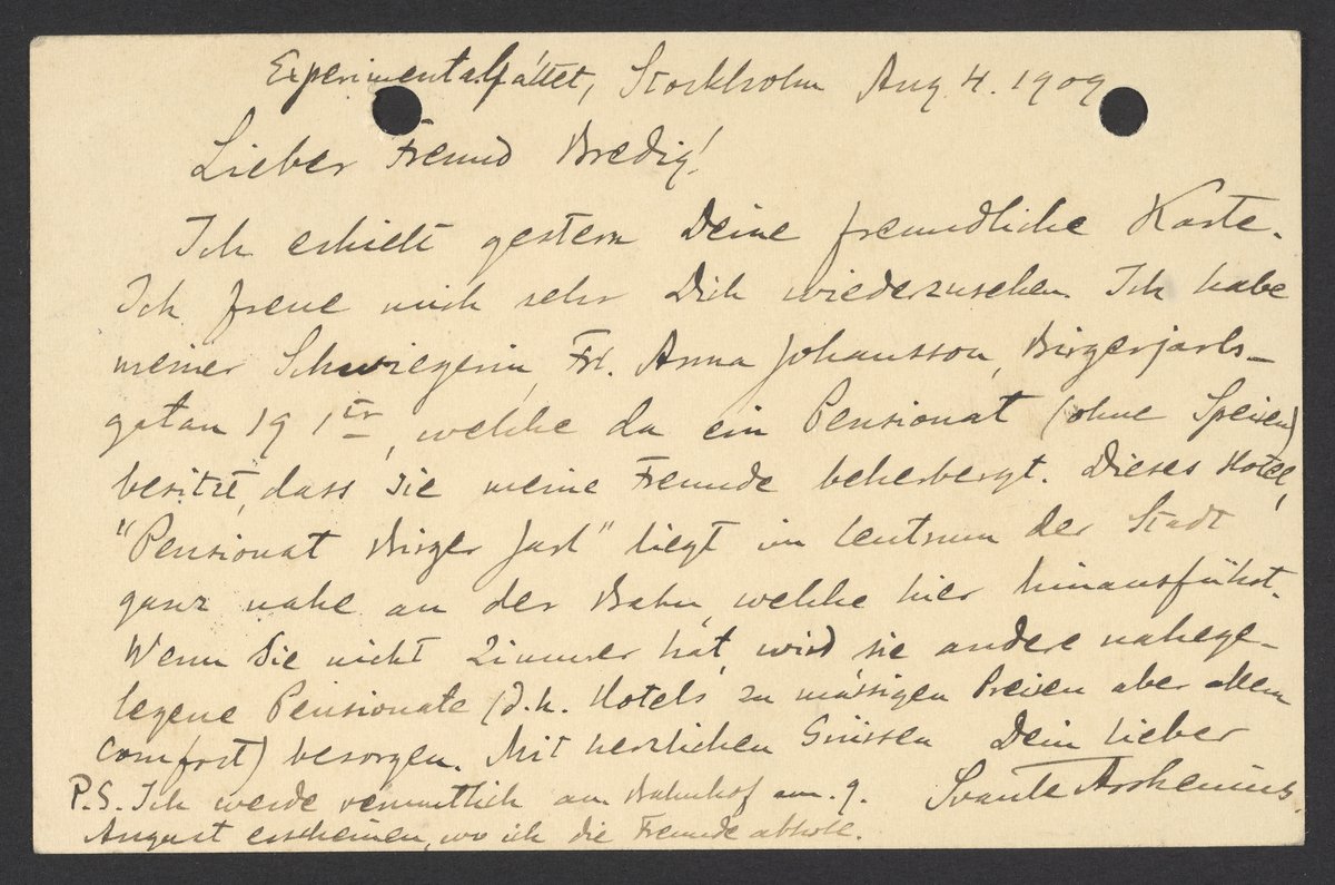 Small JPG1200 x 791px — 178 KBLarge JPG2880 x 1898px — 877 KBFull-sized JPG3531 x 2327px — 1.2 MBOriginal fileTIFF — 3531 x 2327px — 23.6 MBPostcard from Svante Arrhenius (1859-1927) to Georg Bredig (1864-1944) discussing Bredig's lodgings for his upcoming trip to Stockholm, Sweden.