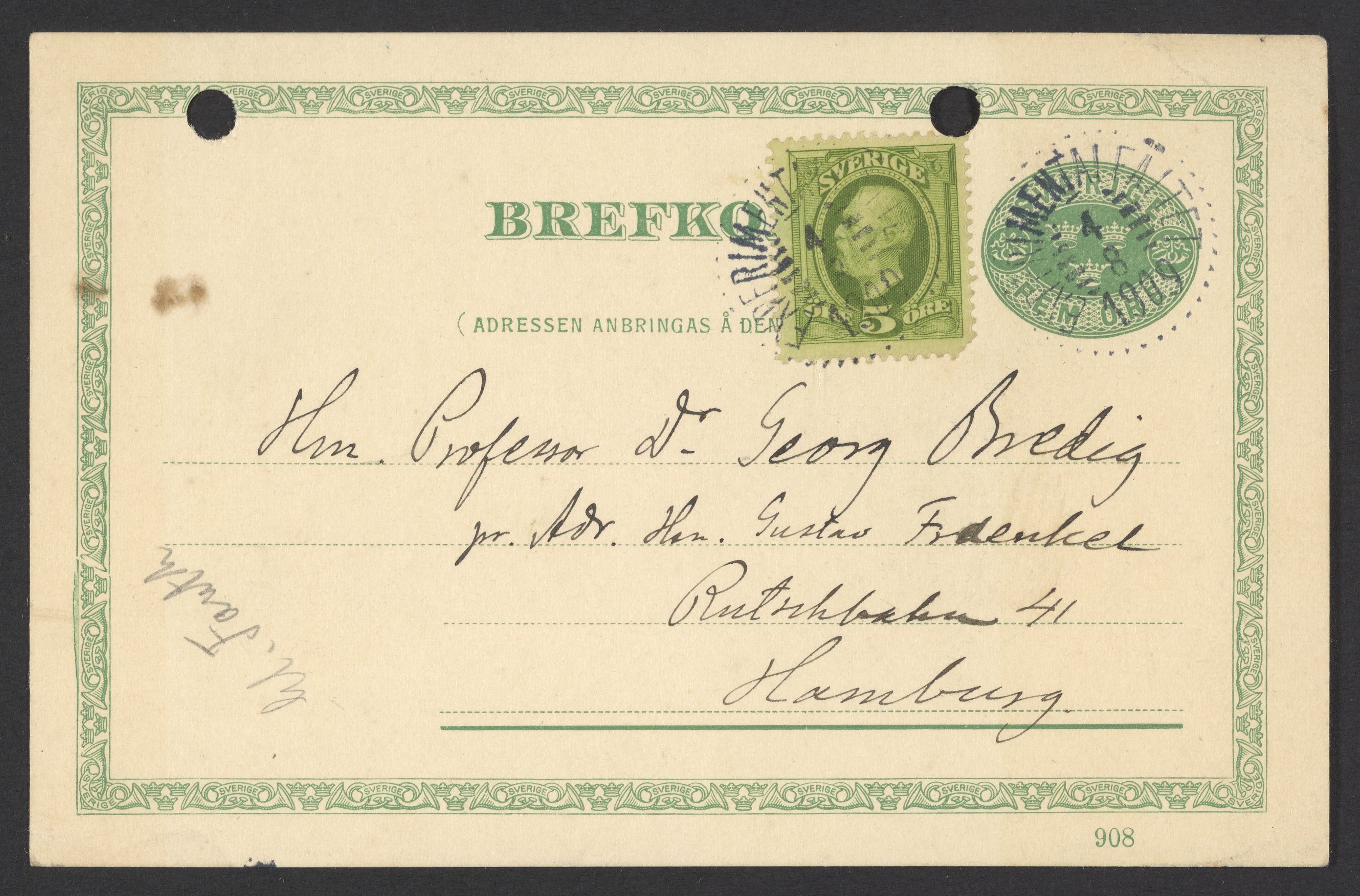 Postcard from Svante Arrhenius to Georg Bredig, August 1909