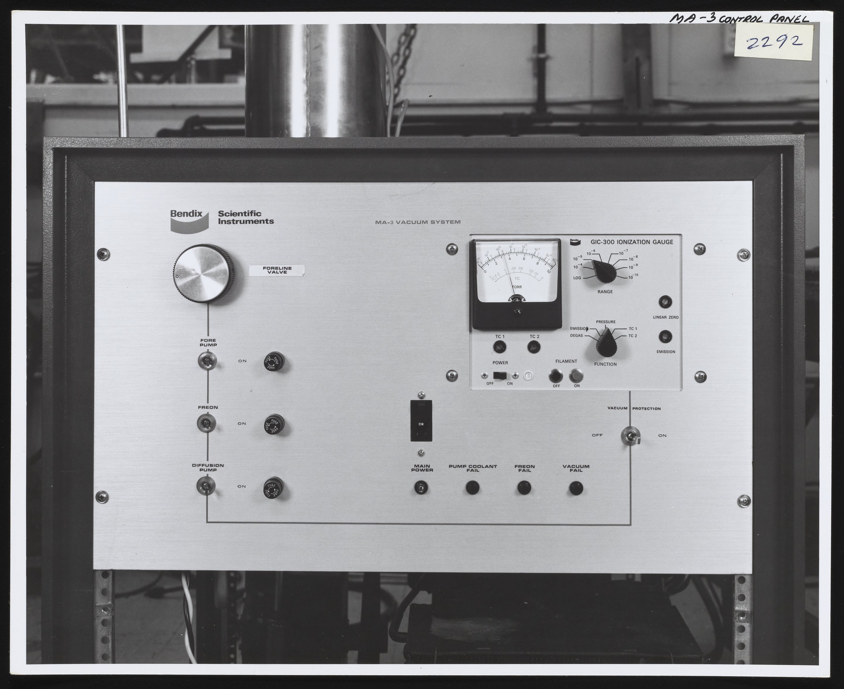 Bendix Corporation. “Control Panel for Bendix MA-3 Vacuum System,” 1970–1979. Photographs from the Bendix Time-of-Flight Mass Spectrometer Collection, Box 2. Science History Institute. Philadelphia. https://digital.sciencehistory.org/works/37720d109.