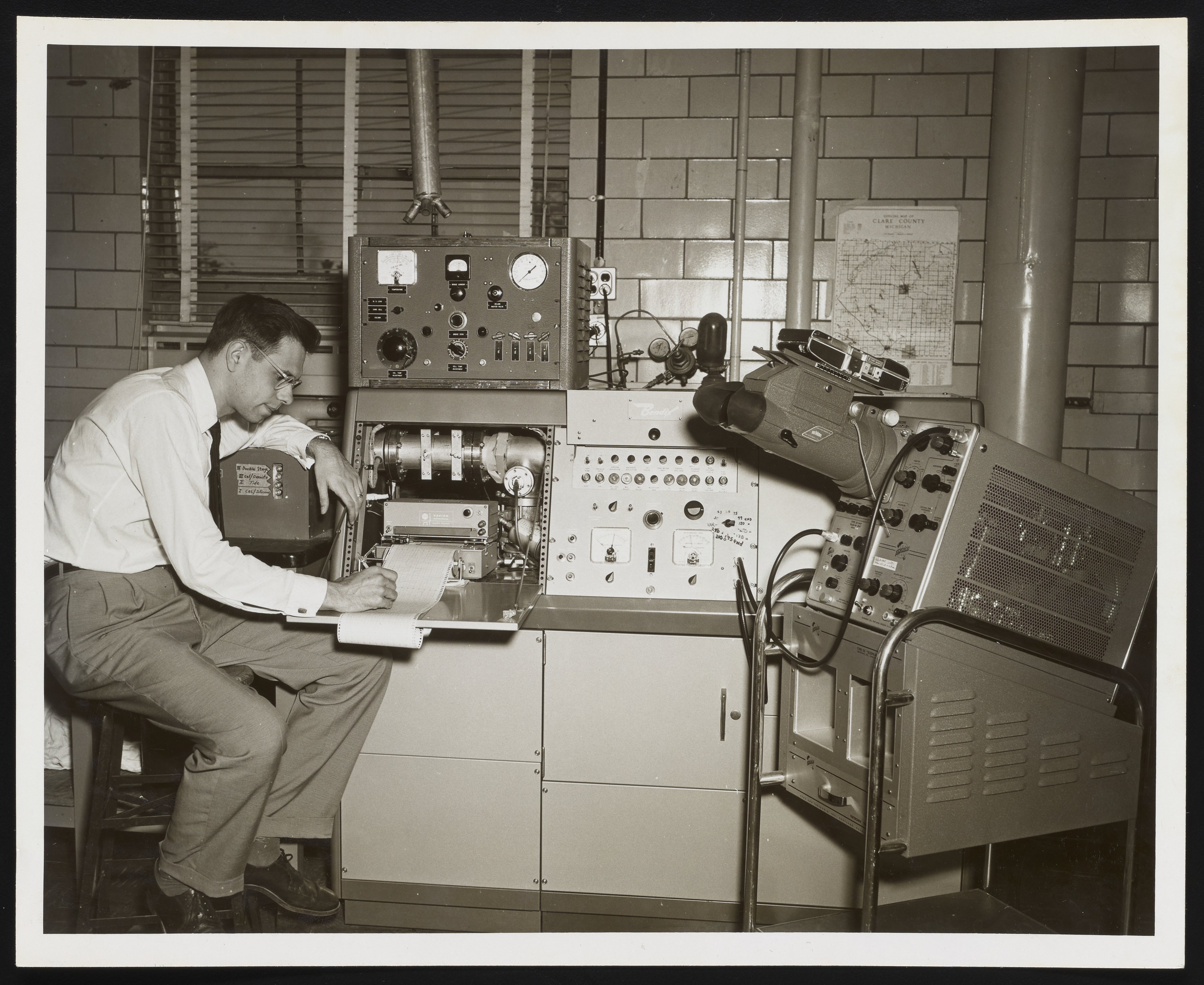 General view of an unidentified Bendix Corporation employee surrounded by assorted scientific instruments from a range of companies, including Bendix, Varian, and DuMont. Per an inscription on the verso of the photograph, this photograph was taken for use in an undated Bendix annual report. Founded in 1924, the Bendix Corporation manufactured a range of scientific instrumentation, most notably the Time-of-Flight Mass Spectrometer (TOFMS).