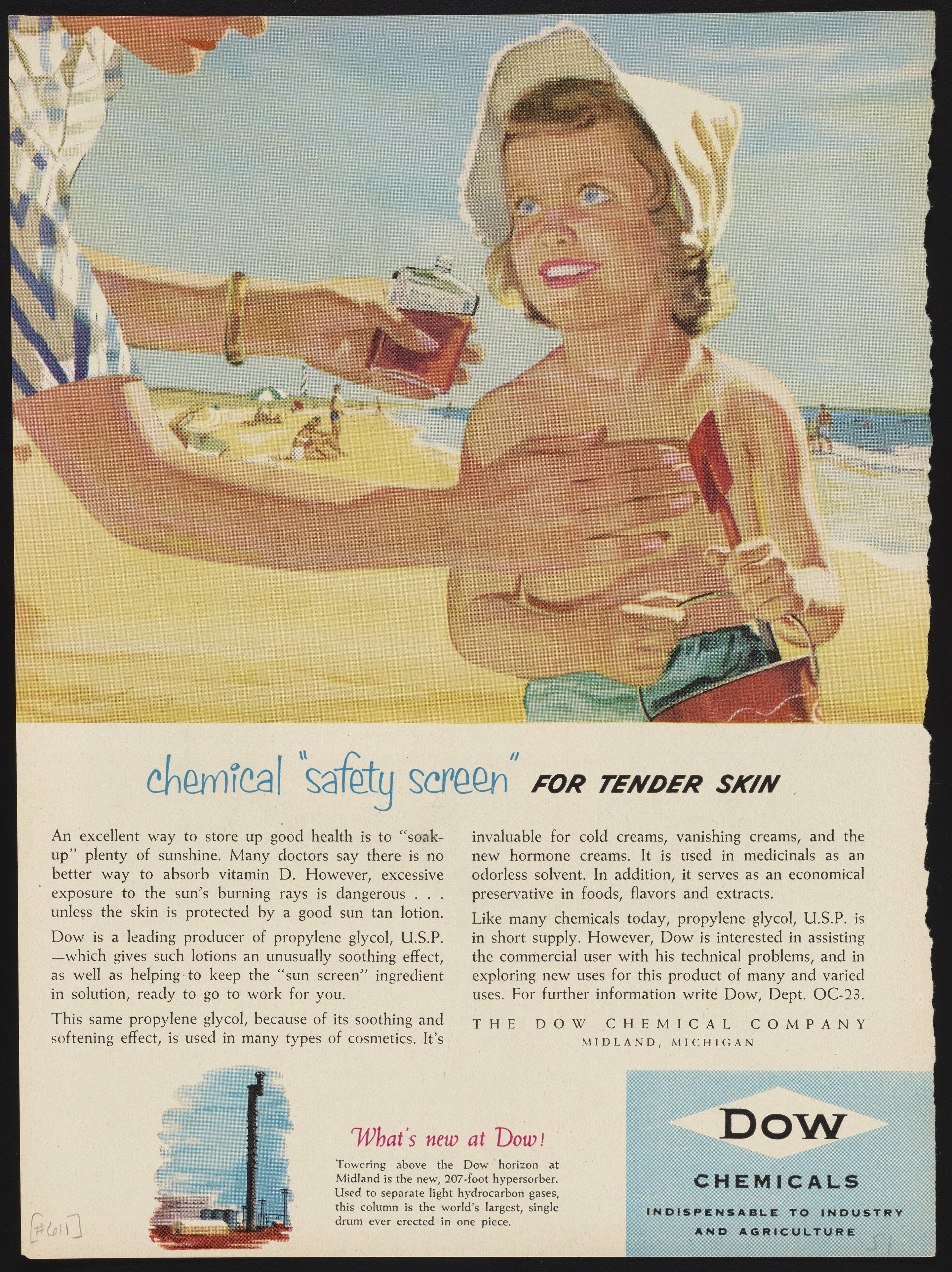 Color print advertisement for propylene glycol, U.S.P. manufactured and sold by the Dow Chemical Company for use as a solvent in sun tan lotions, cold creams, and other medicinal products. The advertisement features an illustrated depiction of a child on a beach, with accompanying text detailing the use of propylene glycol, U.S.P. to augment the "soothing effect" of sun tan lotions and other medicinal creams.