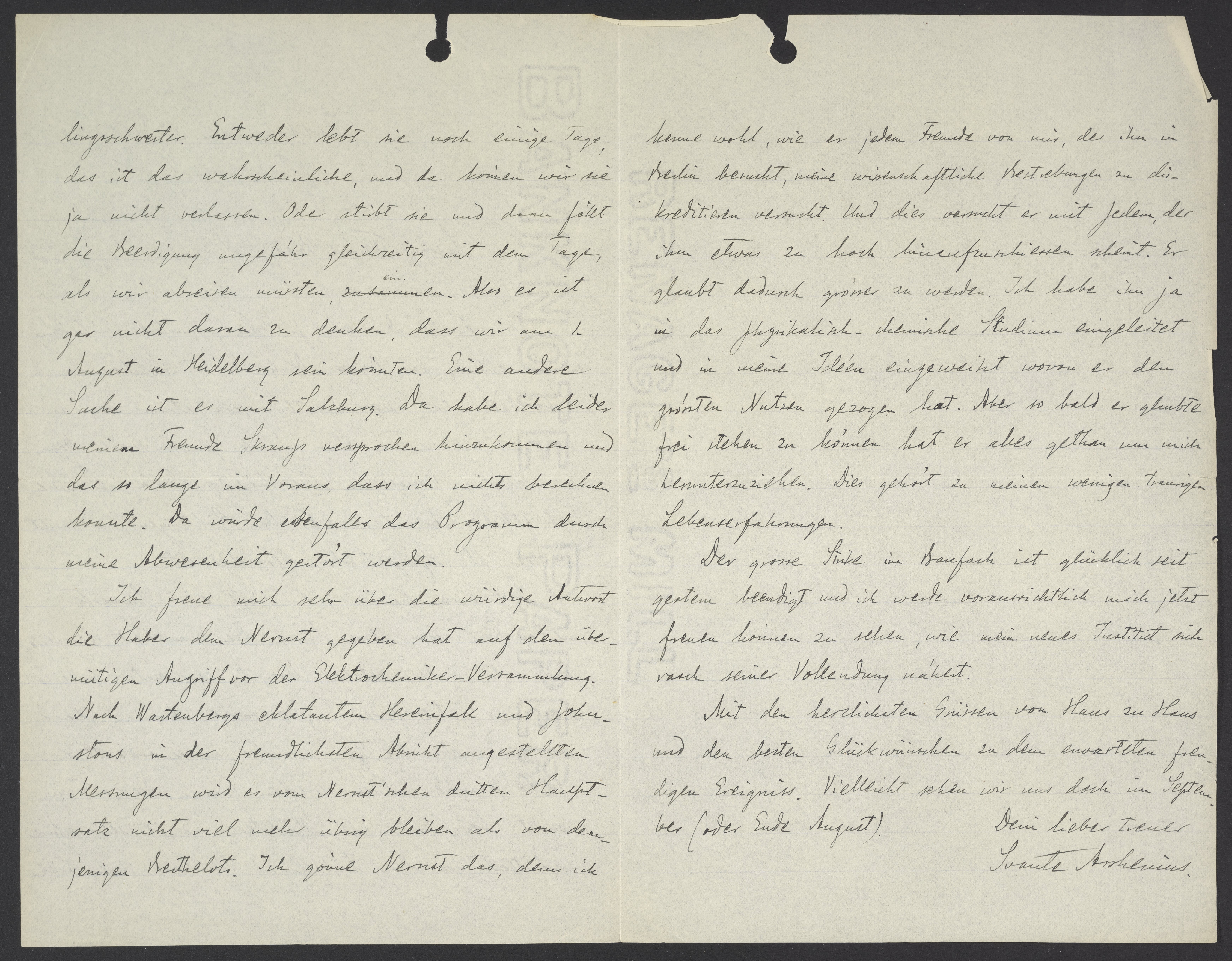 Small JPG1200 x 1797px — 353 KBLarge JPG2880 x 4313px — 1.9 MBFull-sized JPG3626 x 5430px — 2.8 MBOriginal fileTIFF — 3626 x 5430px — 56.4 MBSvante Arrhenius (1859-1927) writes to Georg Bredig (1868-1944) to update him on his personal and professional life. Arrhenius discusses his discontent with fellow chemist Walther Nernst (1864-1941) . This letter provides a small glimpse into the rivalry between Arrhenius and Nernst and the politics in the field of chemistry.