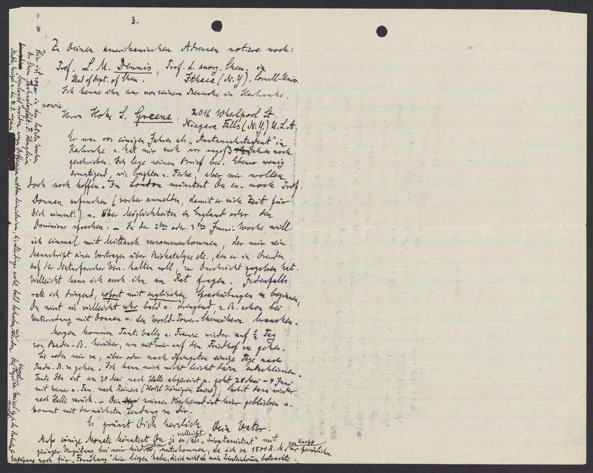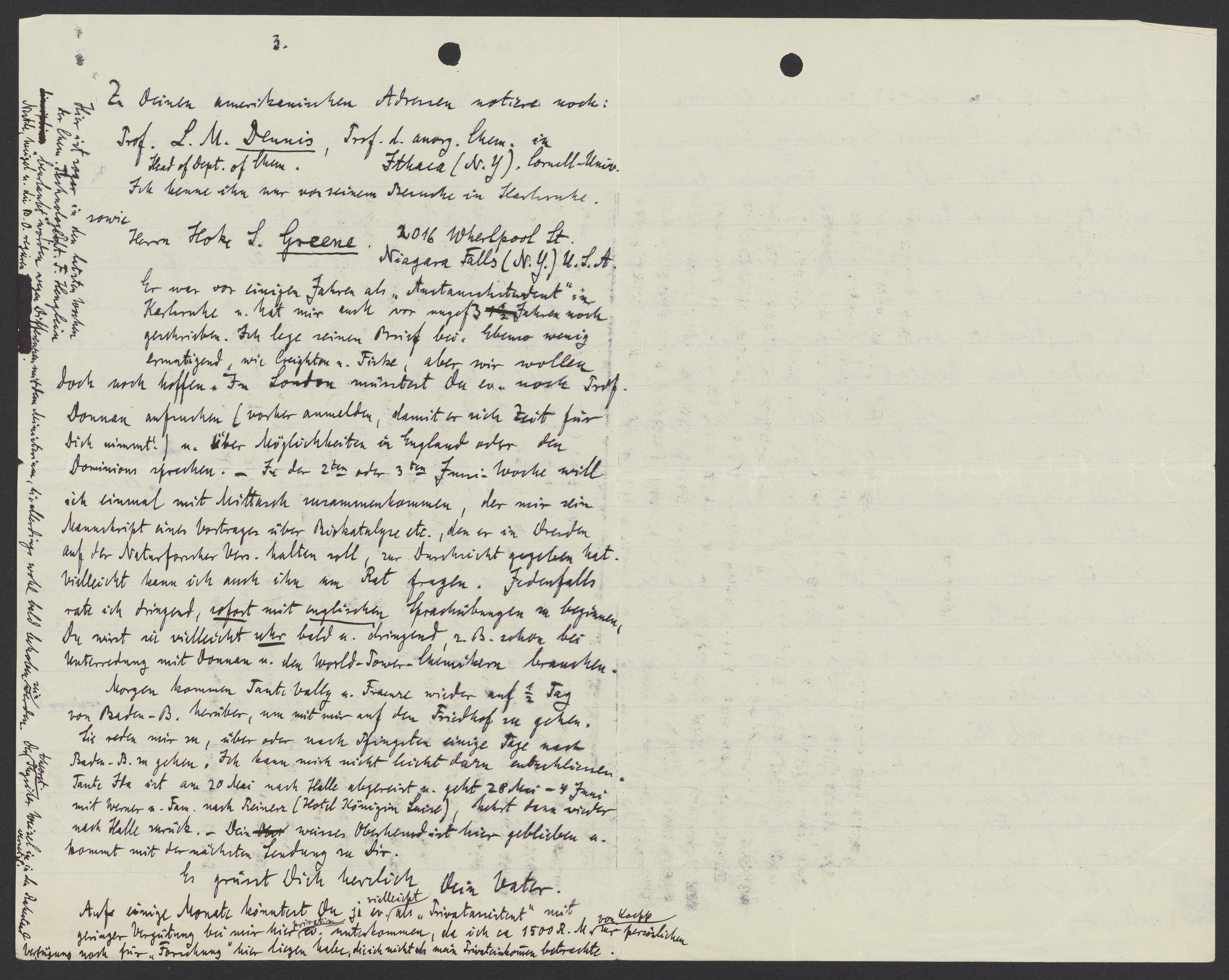 Er war vor einigen Jahren als Austauschstudenten in Karlsruhe u. hat mir auch vor ungef. 3 Jahren noch geschrieben. Ich lege seinen Brief bei. Ebensowenig ermutigend, wie Creighton u. Fiske, aber wir wollen doch noch hoffen. In London müsstest Du ev. noch Prof. Donnan aufsuchen (vorher anmelden, damit er sich Zeit für Dich nimmt!) u. über Möglichkeiten in England oder den Dominions sprechen. – In der 2ten oder 3ten Juni. Woche will ich einmal mit Mittasch zusammenkommen, der mir sein Manuskript eines Vortrages über Bu-Katalyse etc., den er in Dresden auf der Naturforscher Ver. halten soll, zur Durchsicht gegeben hat. Vielleicht kann ich auch ihn um Rat fragen. Jedenfalls rate ich dringend, sofort mit englischen Sprachübungen zu beginnen. Du wirst sie vielleicht sehr bald u. dringend, z.B. schon bei Unterredung mit Donnan u. den World-Power-Chemikern brauchen.