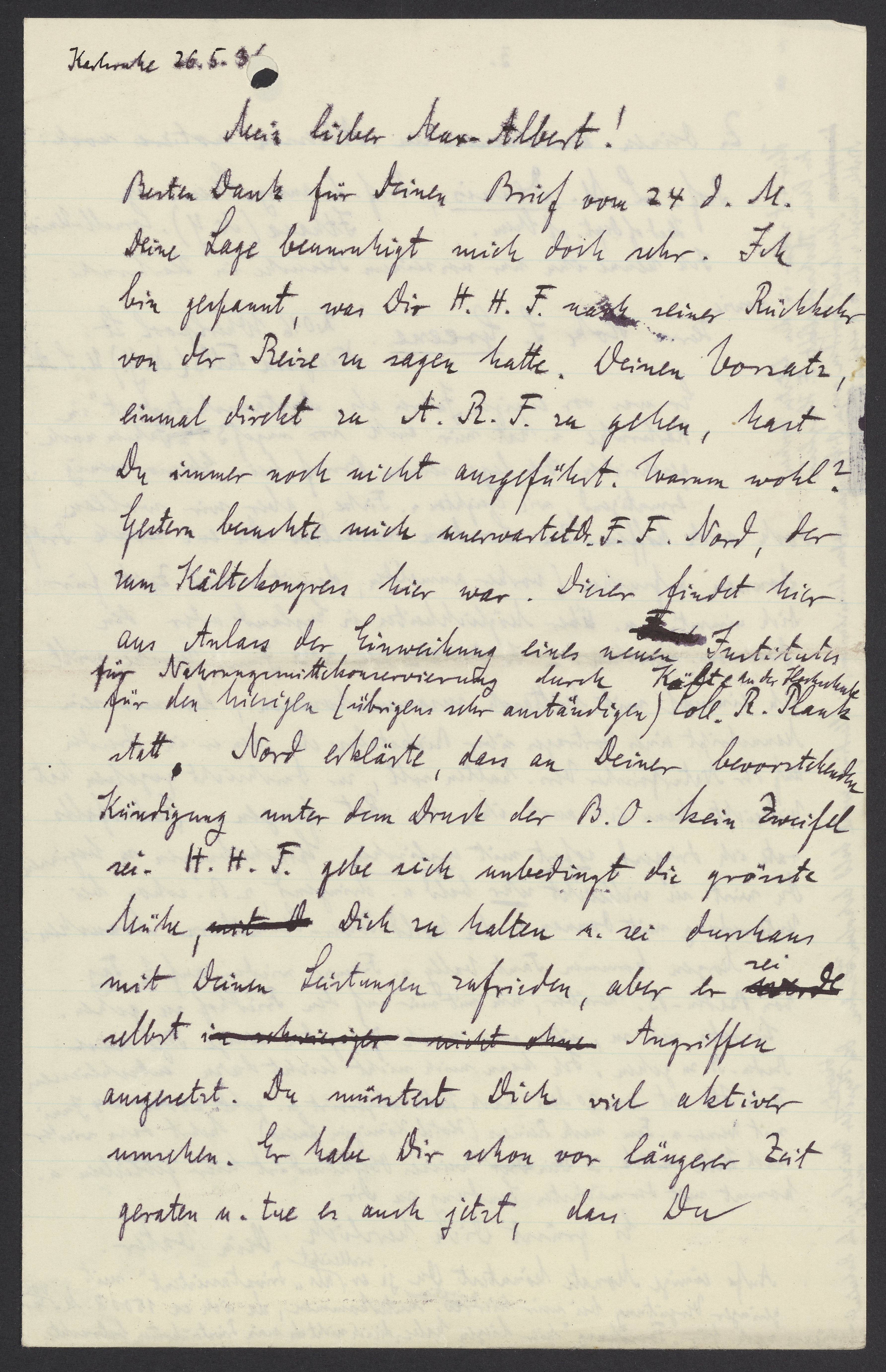 Besten Dank für Deinen Brief vom 24 d.M. Deine Lage beunruhigt mich doch sehr. Ich bin gespannt, was Dir H.H.F nach seiner Rückkehr von der Reise zu sagen hatte. Deinen Vorsatz einmal direkt zu A.R.F. zu gehen, hast Du immer noch nicht ausgeführt. Warum wohl? Gestern besuchte mich unerwartet F.F. Nord, der zu Kältekongress hier war. Dieser findet aus Anlass der Einweihung eines neuen Instituts für Nahrungsmittelkonservierung durch Kälte an der Hochschule für den hiesigen (übrigens sehr anständiger) Cole R. Plank statt. Nord erklärte, dass an Deiner bevorstehende Kündigung unter dem Druck der B.O. kein Zweifel sei. H.H.F gebe sich unbedingt die grösste Mühe, Dich zu halten u. sei durchaus mit Deinen Leistungen zufrieden, aber er sei selbst Angriffen ausgesetzt. Du müsstest Dich viel aktiver umsehen. Er habe Dir schon vor längerer Zeit geraten u. tue es auch jetzt, dass Du