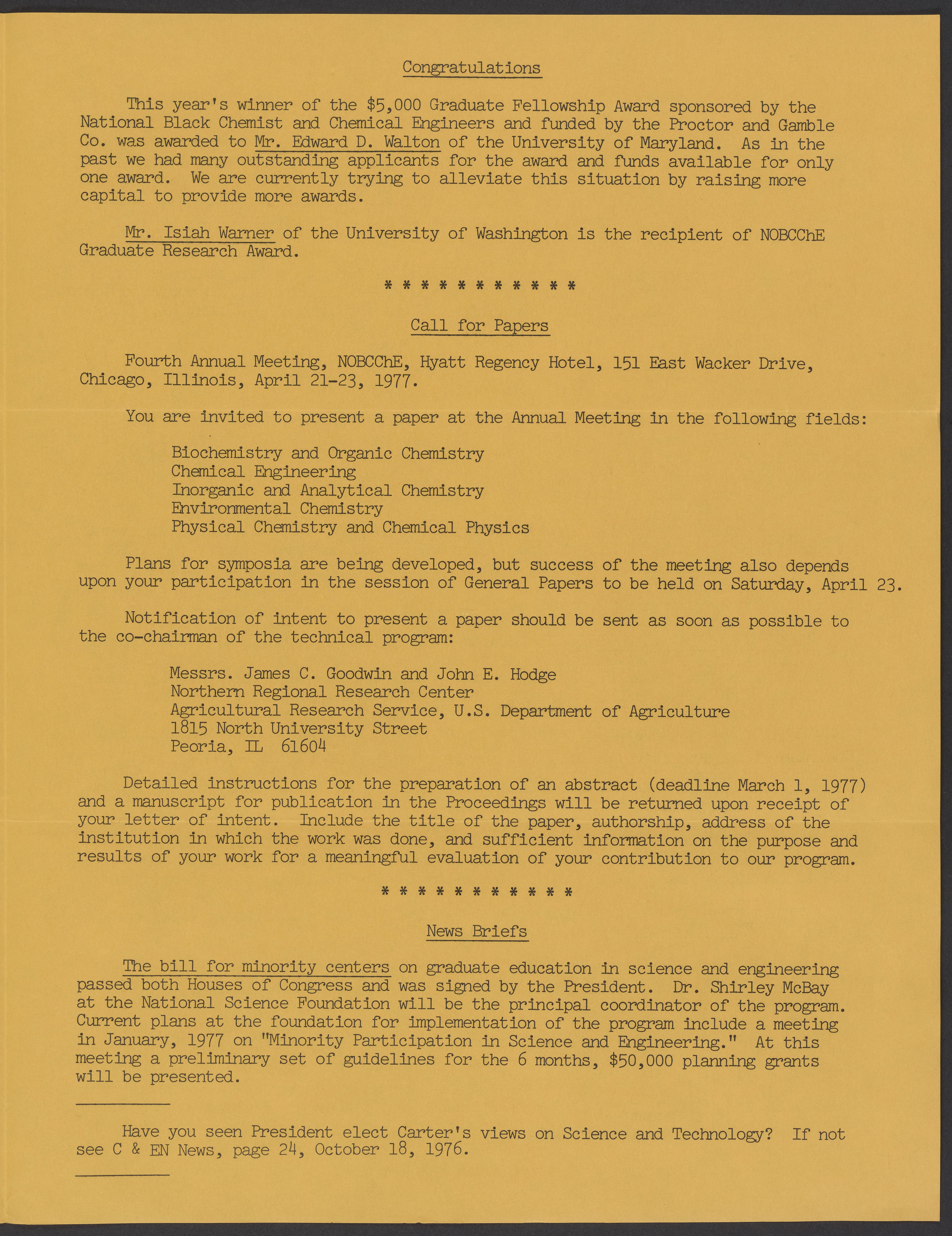 Issue number 4 of the National Organization for the Professional Advancement of Black Chemists and Chemical Engineers (NOBCChE) newsletter, published December 1976.
