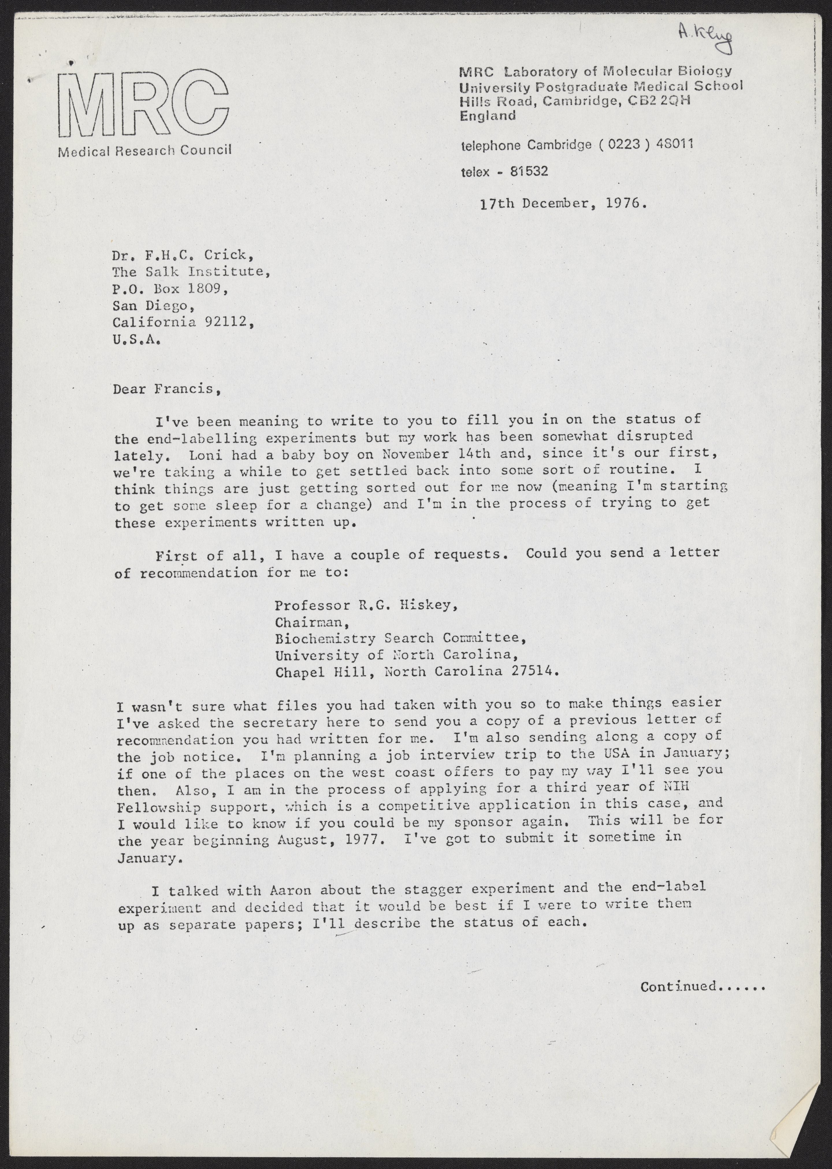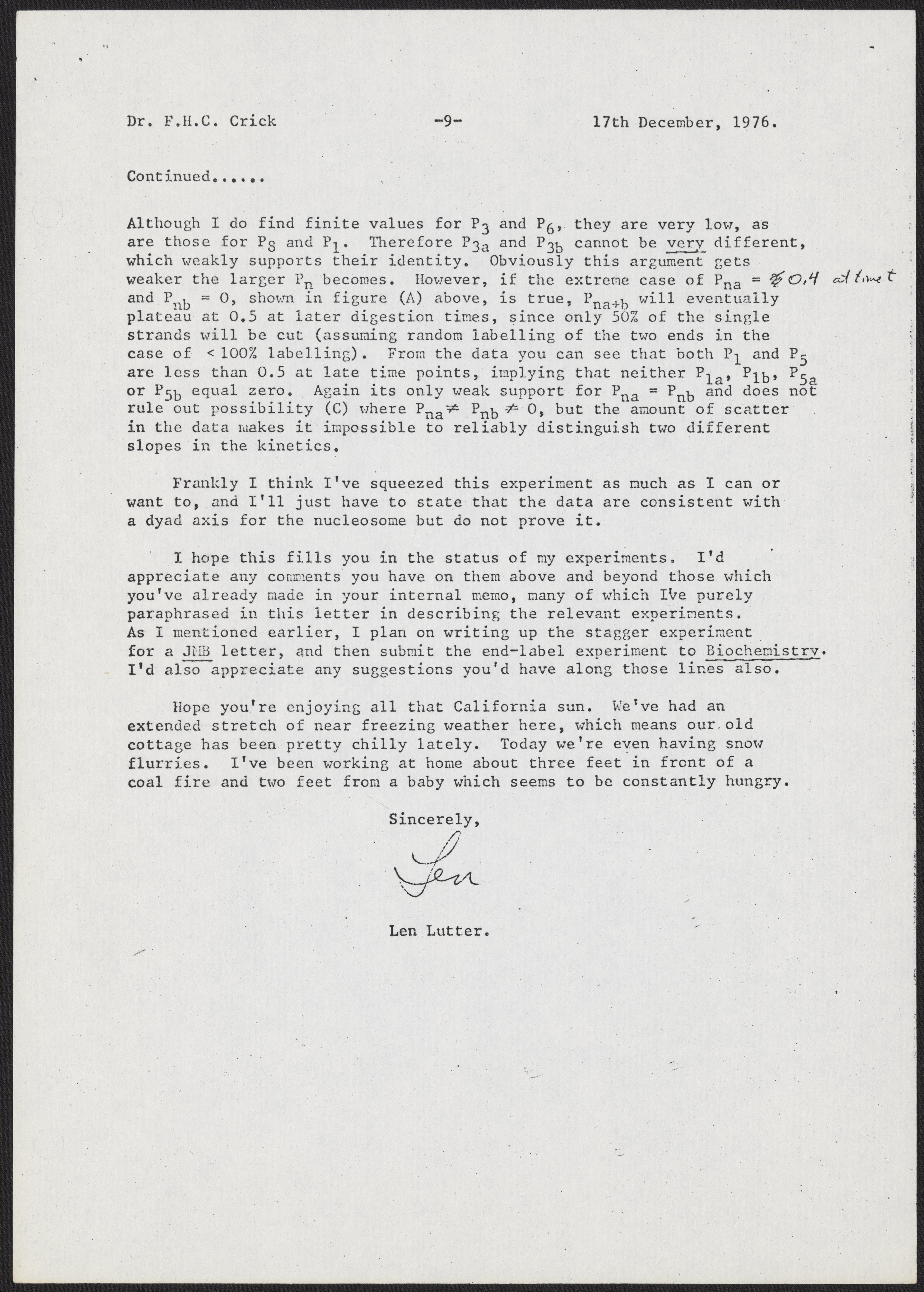 Lutter, Leonard. “Letter from Leonard Lutter to Francis Crick, December 17, 1976,” December 17, 1976. History of Molecular Biology Collection, Box 19, Folder 26. Science History Institute. Philadelphia. https://digital.sciencehistory.org/works/3b0gvr0.