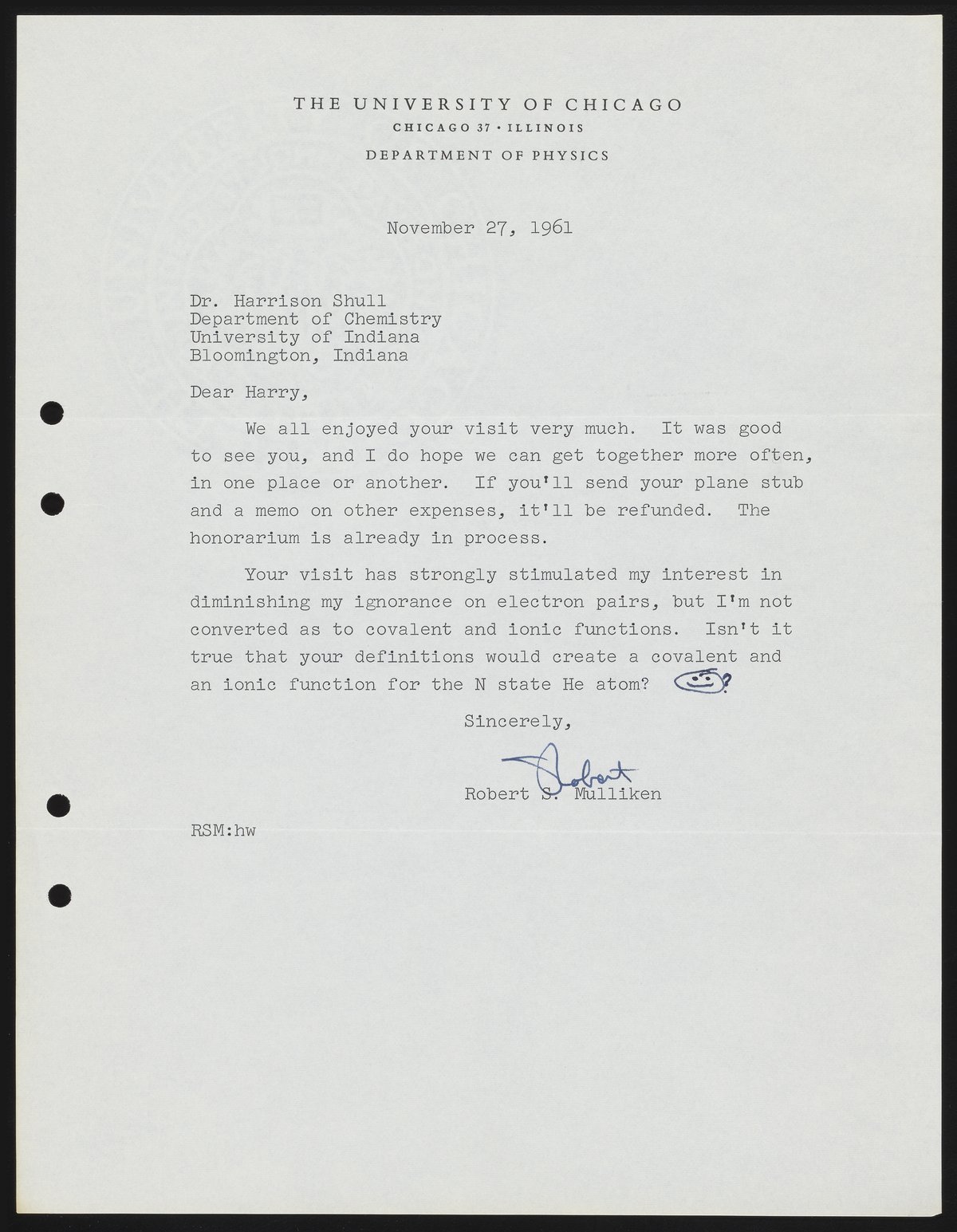 Mulliken, Robert Sanderson. “Letter from Robert S. Mulliken to Harrison Shull, 1961,” November 27, 1961. Robert S. Mulliken & Harrison Shull Correspondence, Box 1. Science History Institute. Philadelphia. https://digital.sciencehistory.org/works/3b591867r.