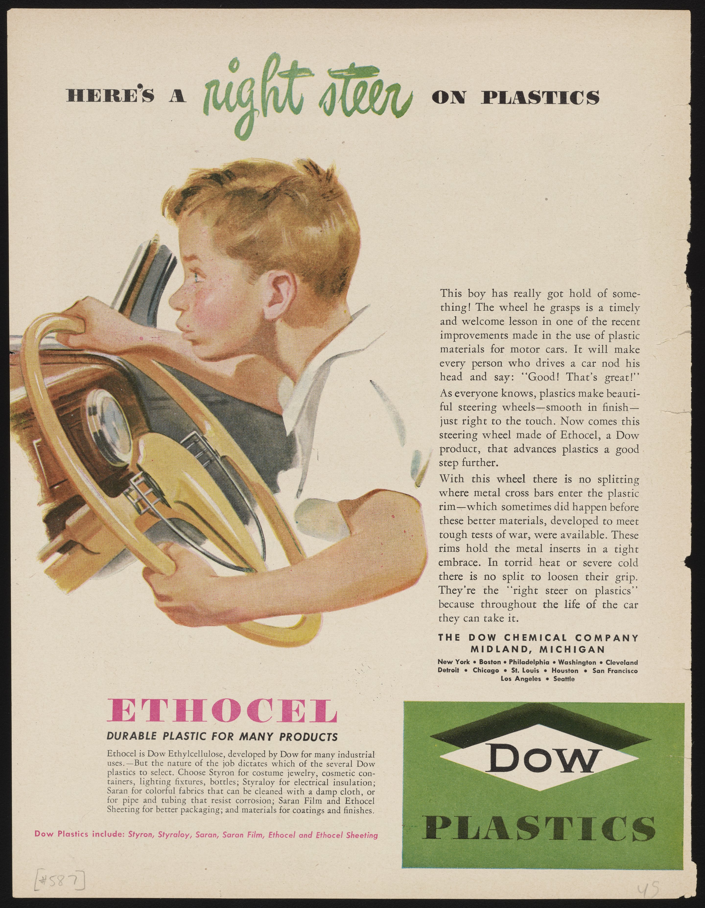 Dow Chemical Company. “Here's a Right Steer on Plastics,” circa 1945. Advertisements from the Dow Chemical Historical Collection, Box 9. Science History Institute. Philadelphia. https://digital.sciencehistory.org/works/3b591990r.