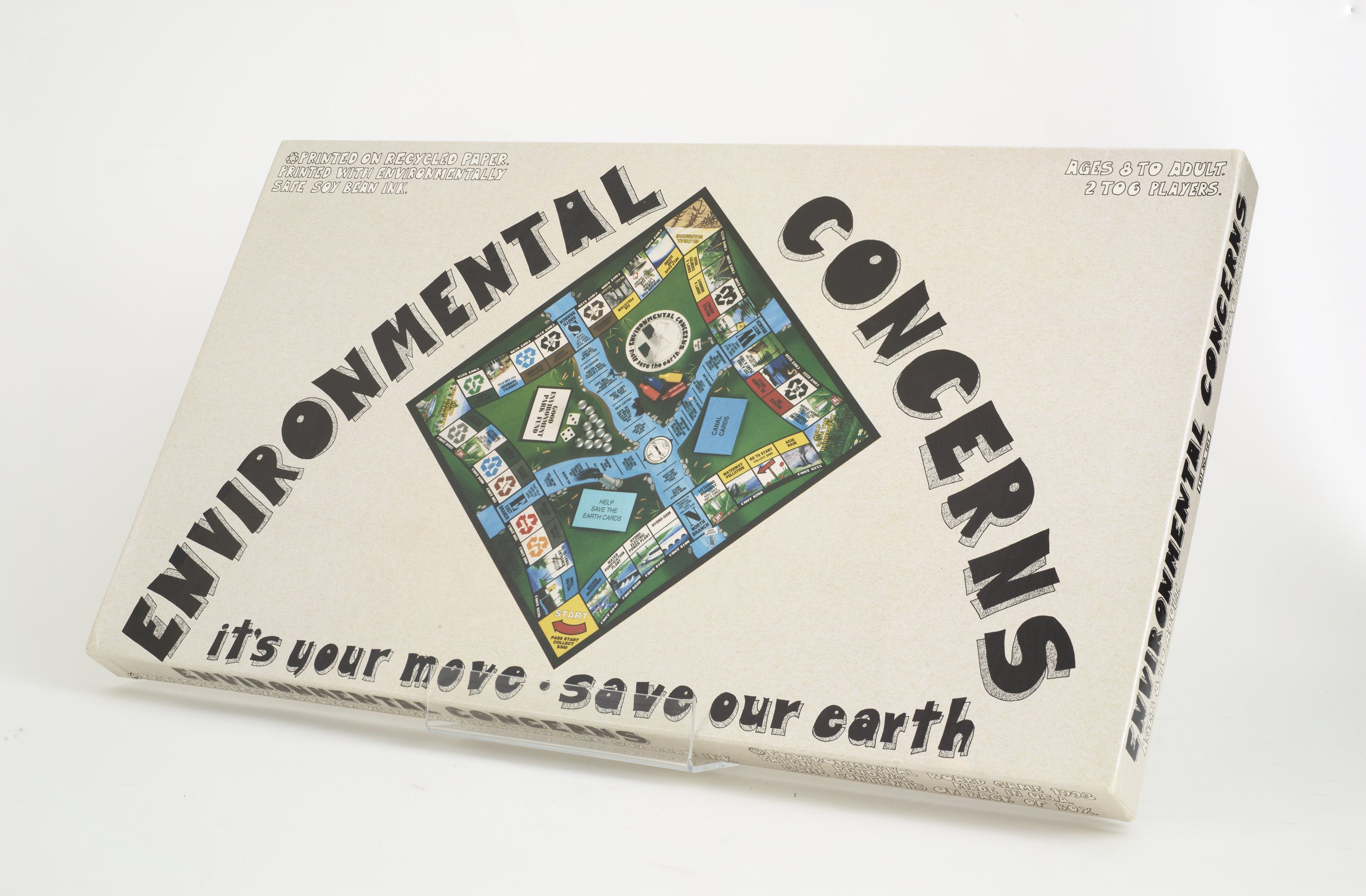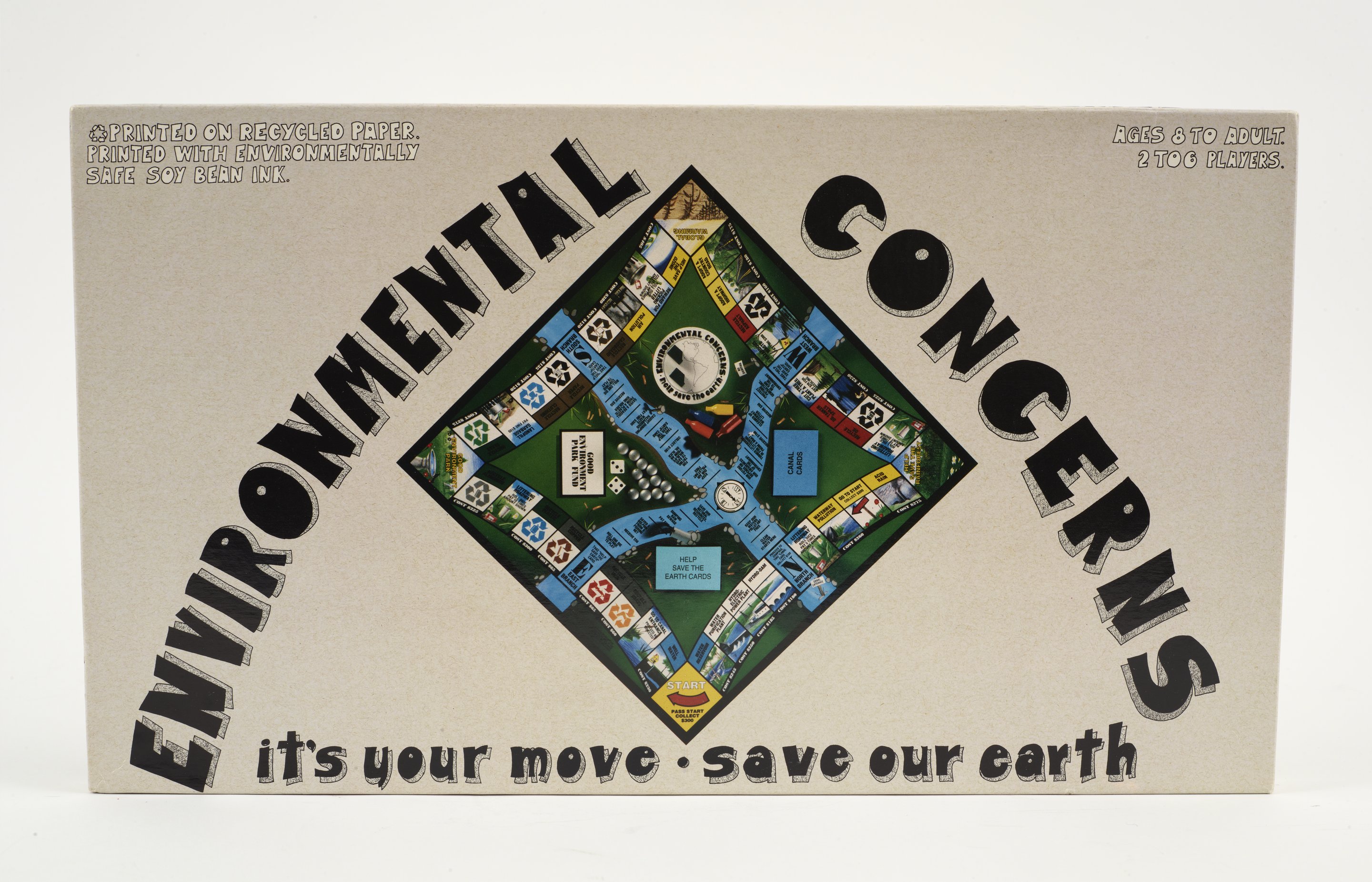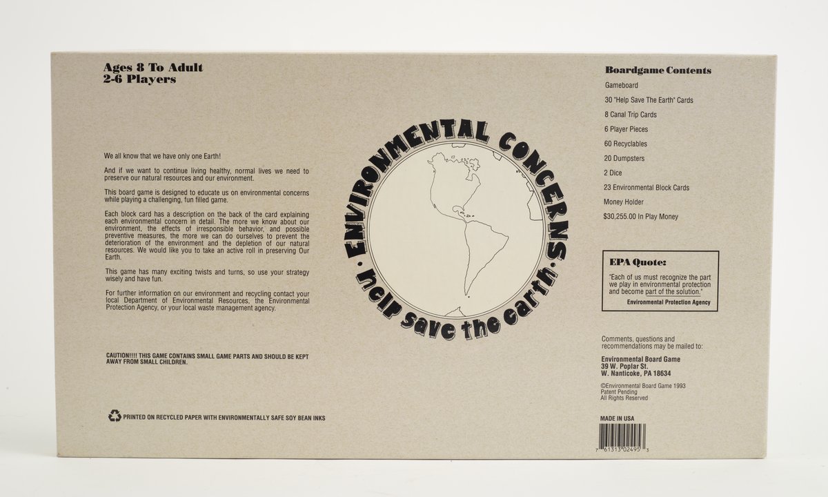 Small JPG1200 x 946px — 219 KBLarge JPG2880 x 2271px — 905 KBFull-sized JPG8966 x 7071px — 5.9 MBOriginal fileTIFF — 8966 x 7071px — 181 MBA rectangular beige game box with black text and an image of the game board printed on the cover. The box contains instructions, 30 "Help Save the Earth" cards, 8 "Canal Trip" cards, 6 wood player pieces, 60 silver wood "Recyclables", 20 green wood "Dumpsters", 2 plastic dice, 23 Environmental Block cards, and paper play money with organizer.