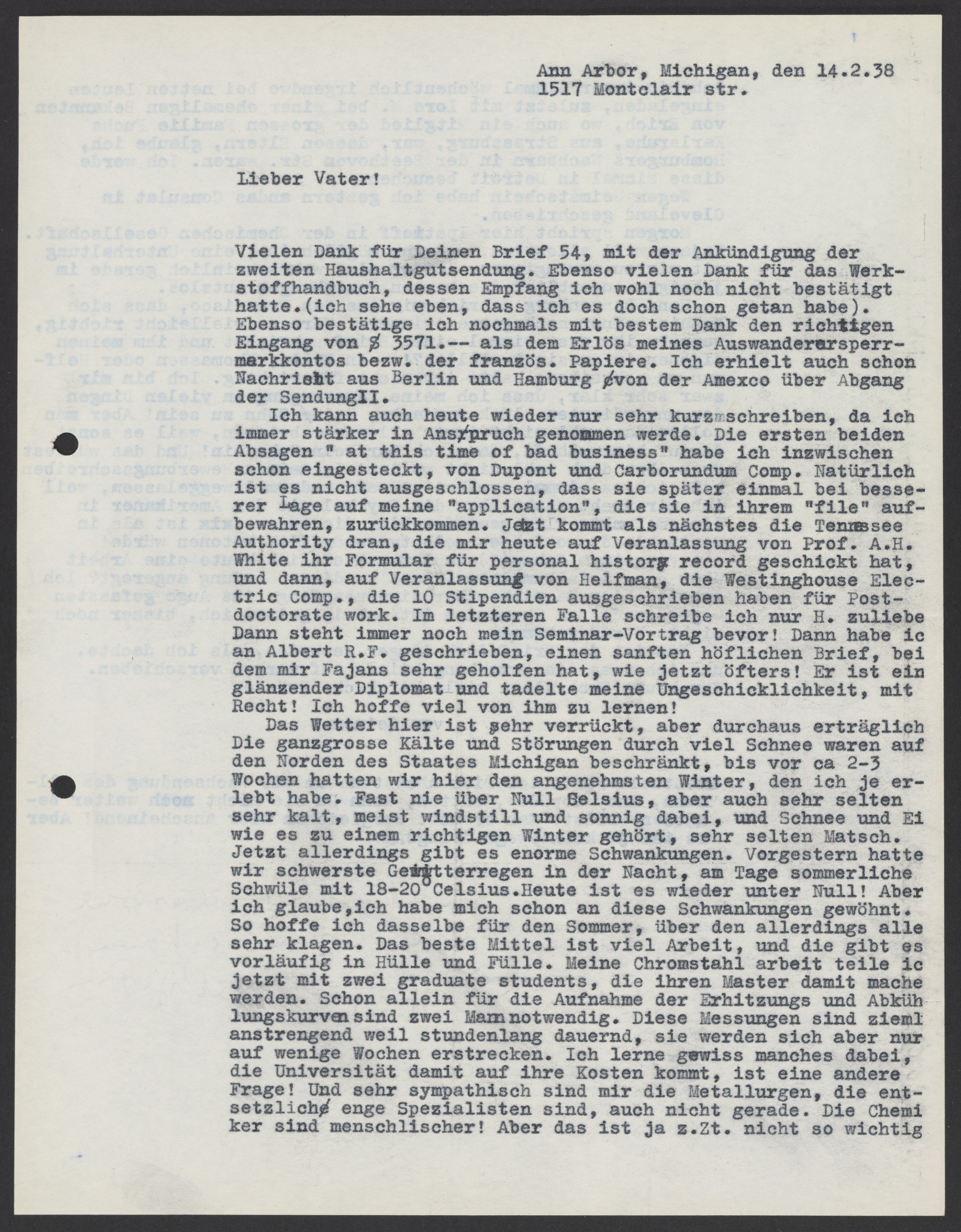 Letter from Max Bredig to Georg Bredig, February 14, 1938