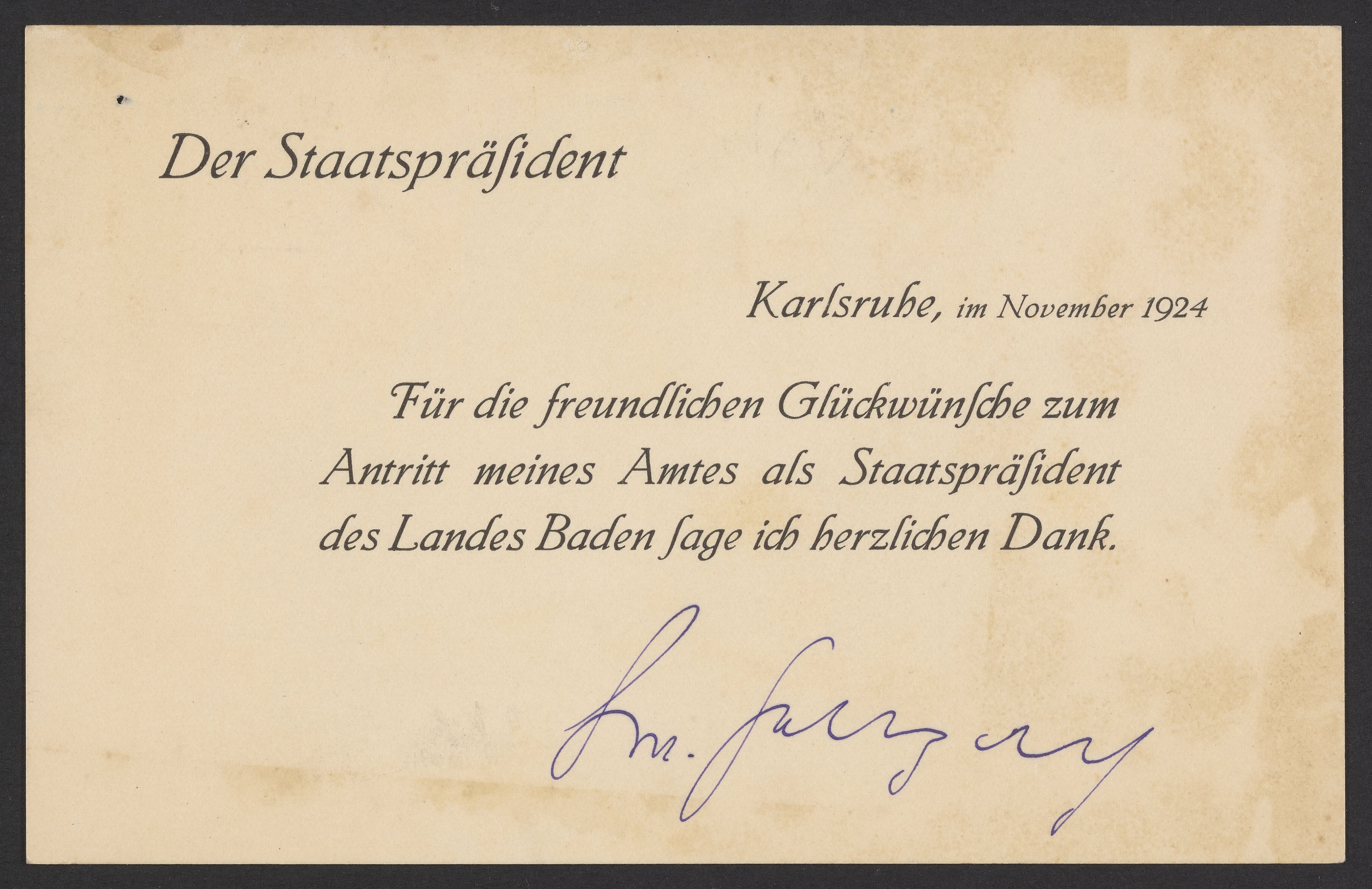 Thank You Card from Willy Hellpach to Georg Bredig, November 1924