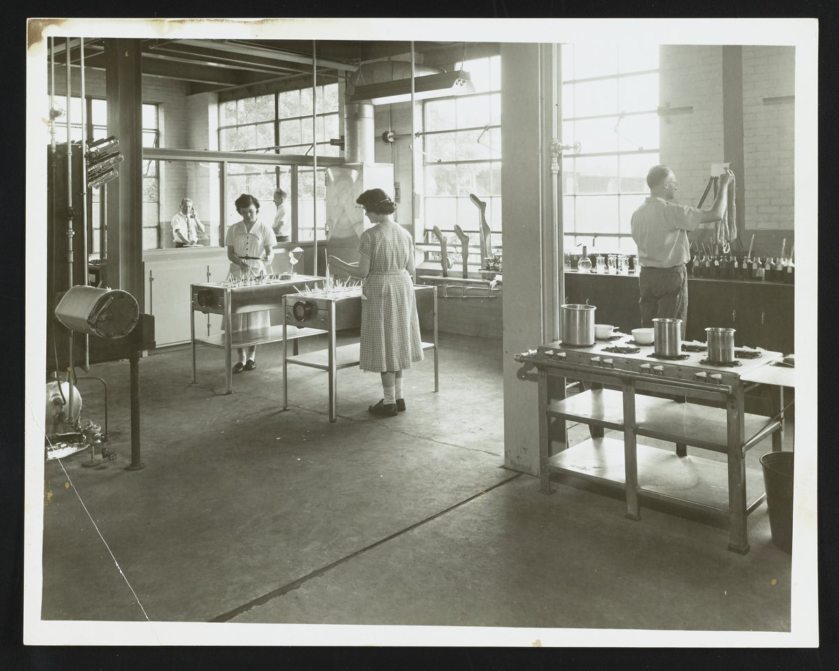 View of dyeing technicians working in the Customer Service and Quality Control Laboratory at the Althouse Chemical Company plant in Reading, Pennsylvania. The technicians are engaged in a skein dyeing process whereby lengths of yarn are dipped into a receptacle containing dye pigment. In the Althouse laboratory, this process was typically used either to test quality control of plant production lots or treat final research and development samples. Several dress forms typically used to give shape to nylon stockings are also visible near the windows.