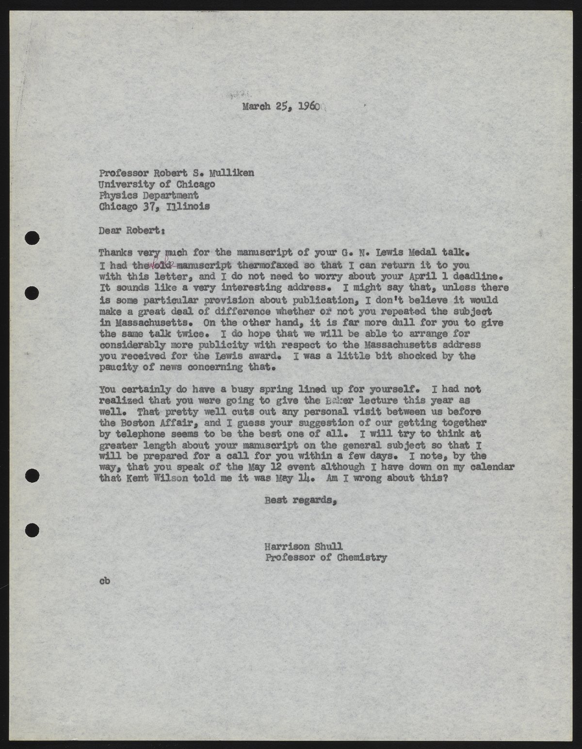 Letter between Harrison Shull and Robert S. Mulliken, American quantum chemists, concerning several lectures given and planned by Mulliken, including the G. N. Lewis Medal address and the Baker lecture.