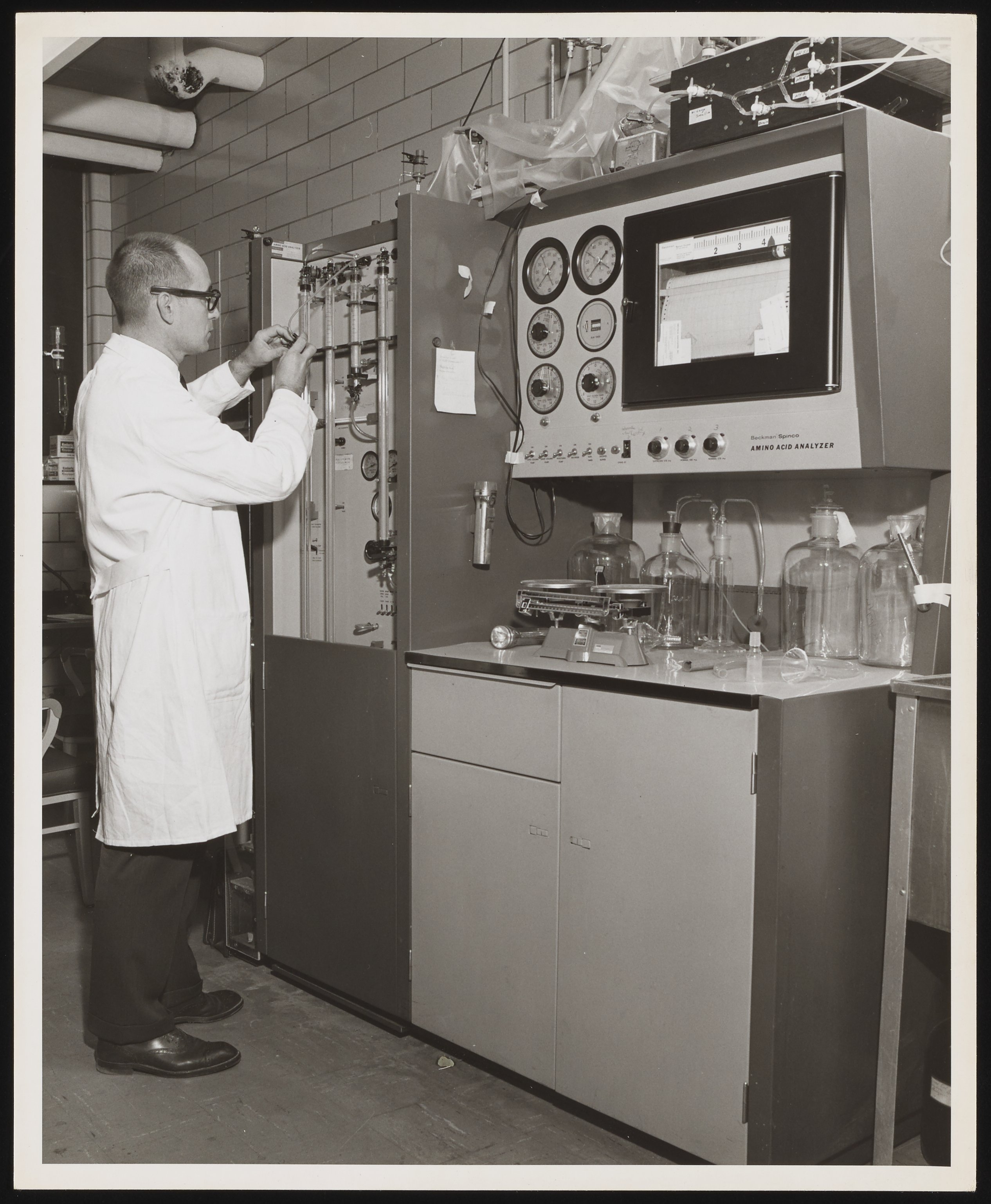 “Unidentified Man Using a Beckman/Spinco Model 120 Amino Acid Analyzer,” n.d. Beckman Historical Collection, Box 59, Folder 96. Science History Institute. Philadelphia. https://digital.sciencehistory.org/works/3f462554x.