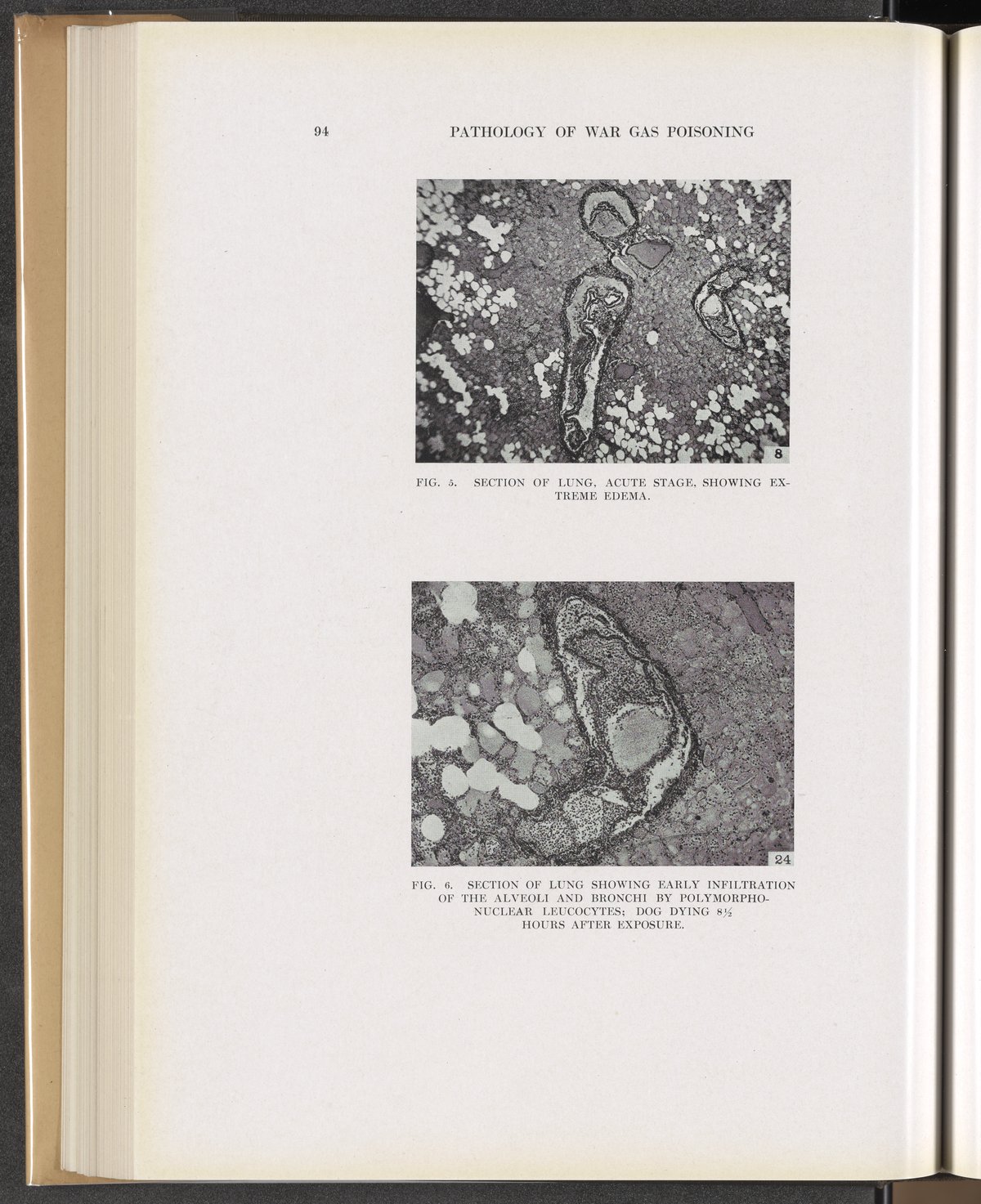 Winternitz, M. C. (Milton C.). “Fig. 5: Section of Lung, Acute Stage, Showing Extreme Edema. Fig. 6: Section of Lung Showing Early Infiltration of the Alveoli and Bronchi by Polymorphonuclear Leucocytes; Dog Dying 8 1/2 Hours after Exposure.” Collected Studies on the Pathology of War Gas Poisoning. New Haven, Connecticut: Yale University Press, 1920. https://digital.sciencehistory.org/works/3f462561b.