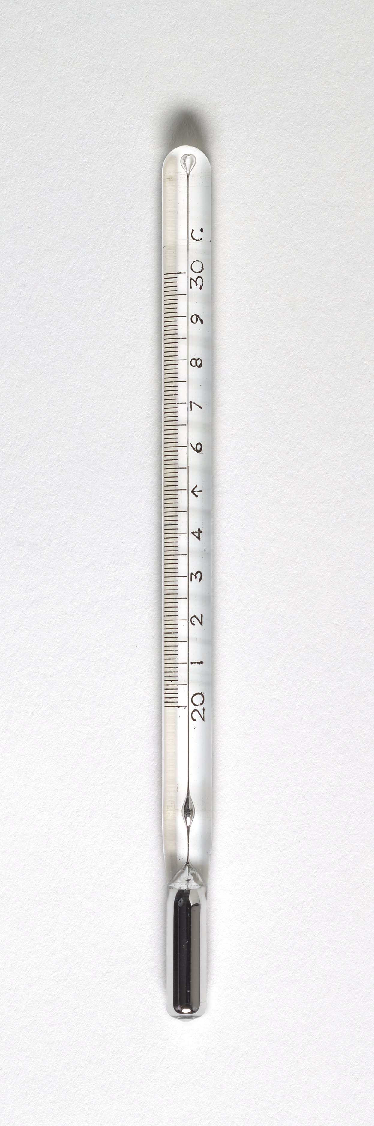 A: Bulb containing mercury attached to a glass tube of narrow diameter. Thermometer has Celsius scale with 20-30 degree range with major divisions every 1 degree and minor divisions every 0.1 degree.