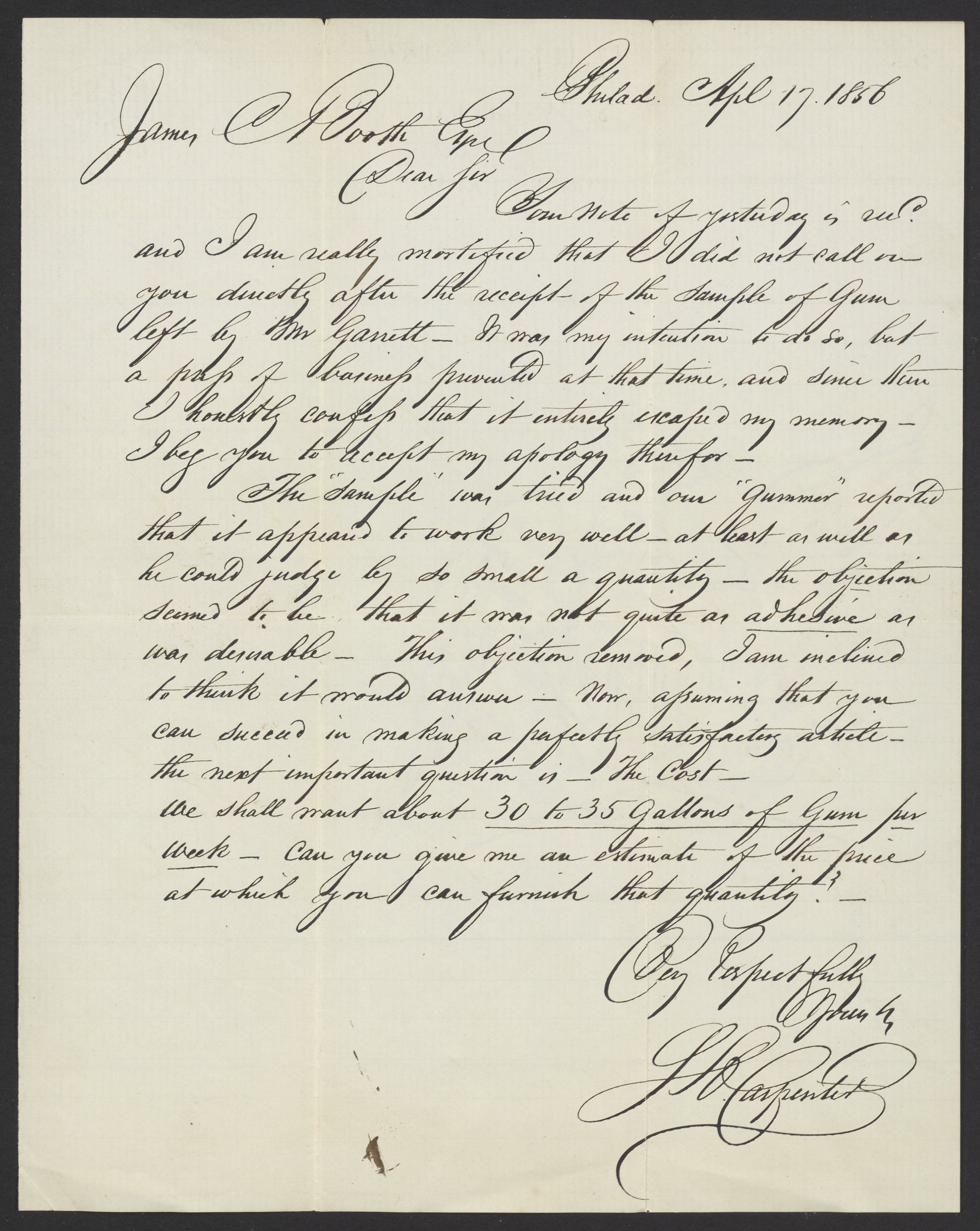 Carpenter, S. H. “Letter from S.H. Carpenter to James Curtis Booth, April 17, 1856,” April 17, 1856. Papers of James Curtis Booth, Box 1, Folder 7. Science History Institute. Philadelphia. https://digital.sciencehistory.org/works/3f87koo.