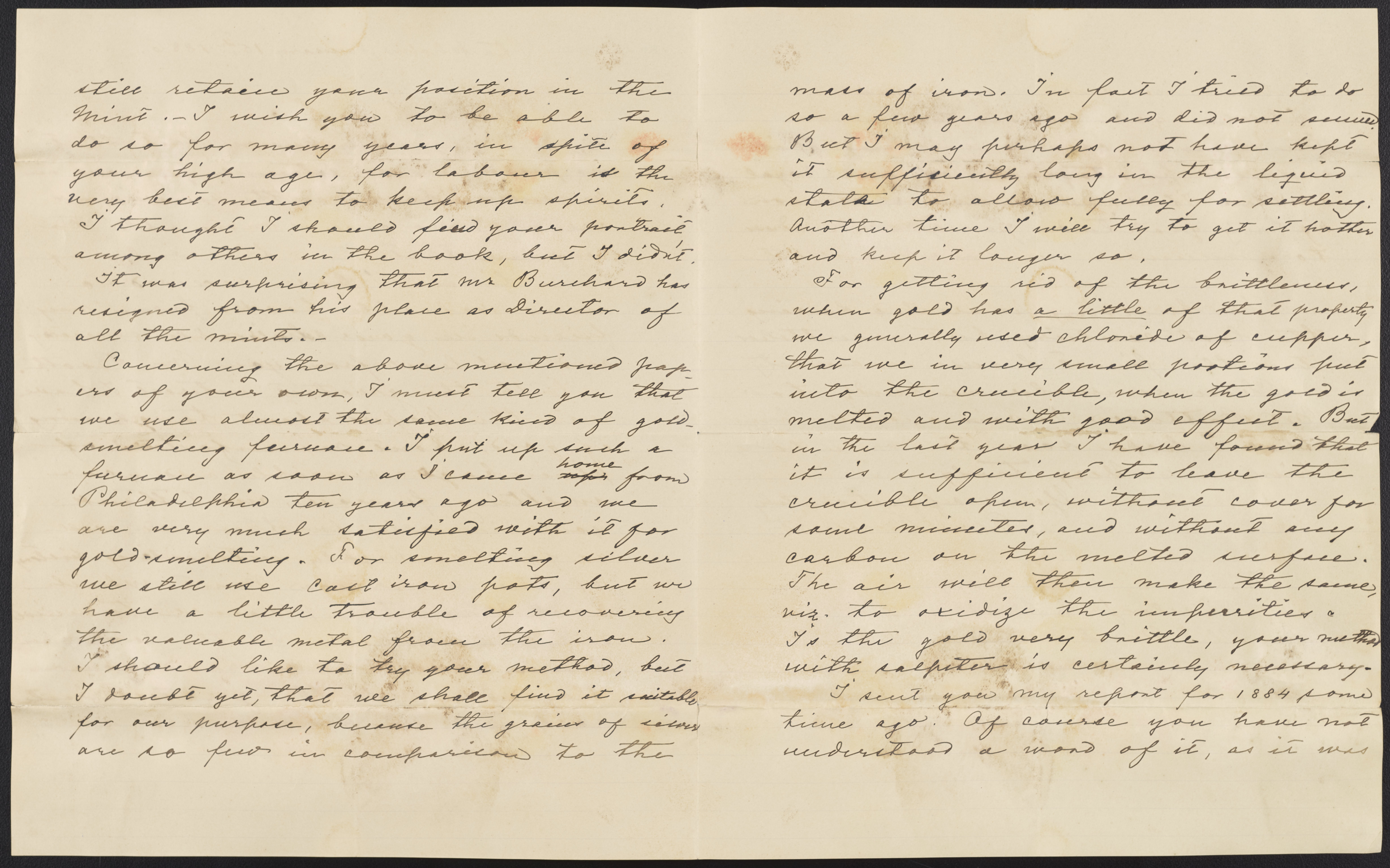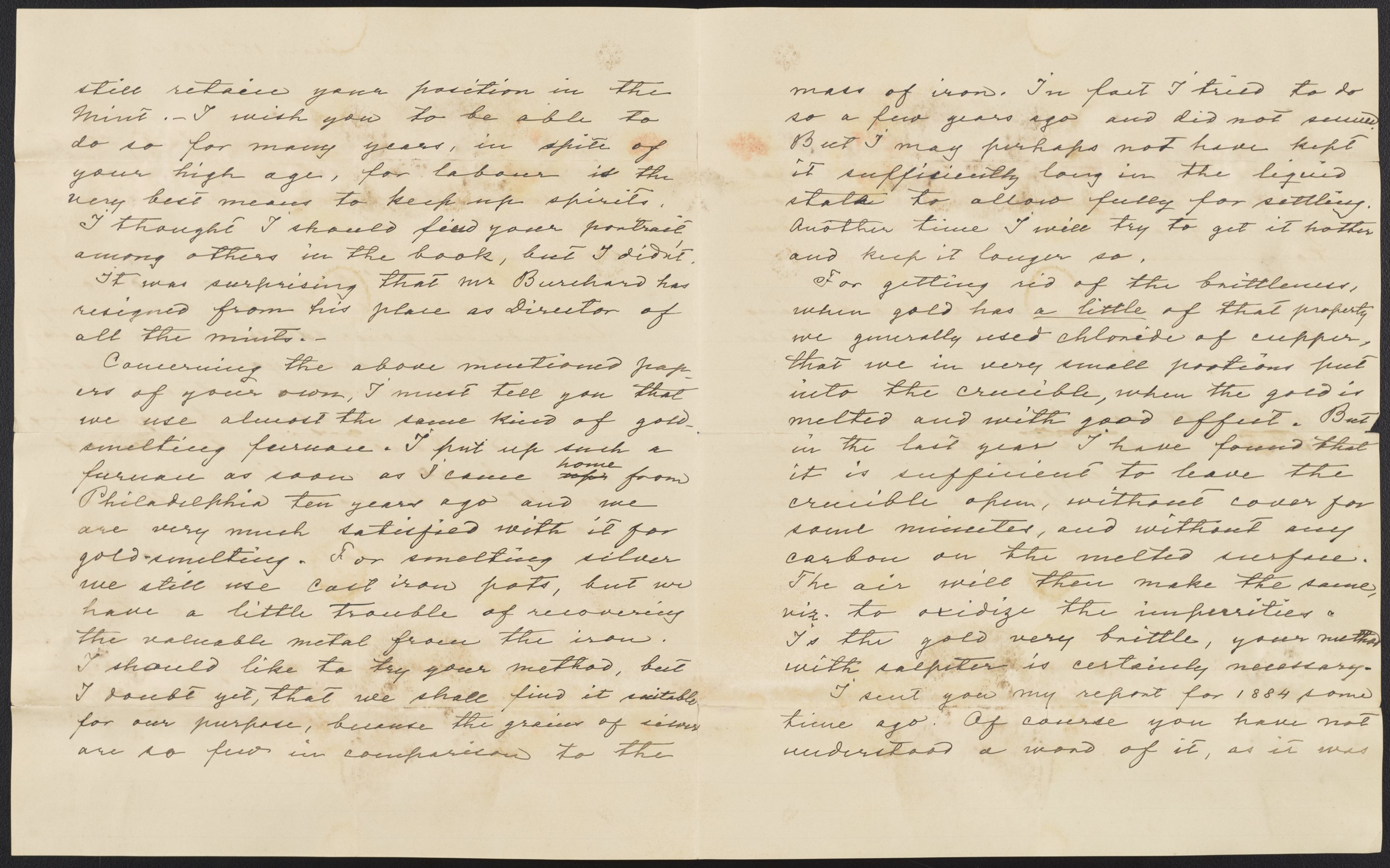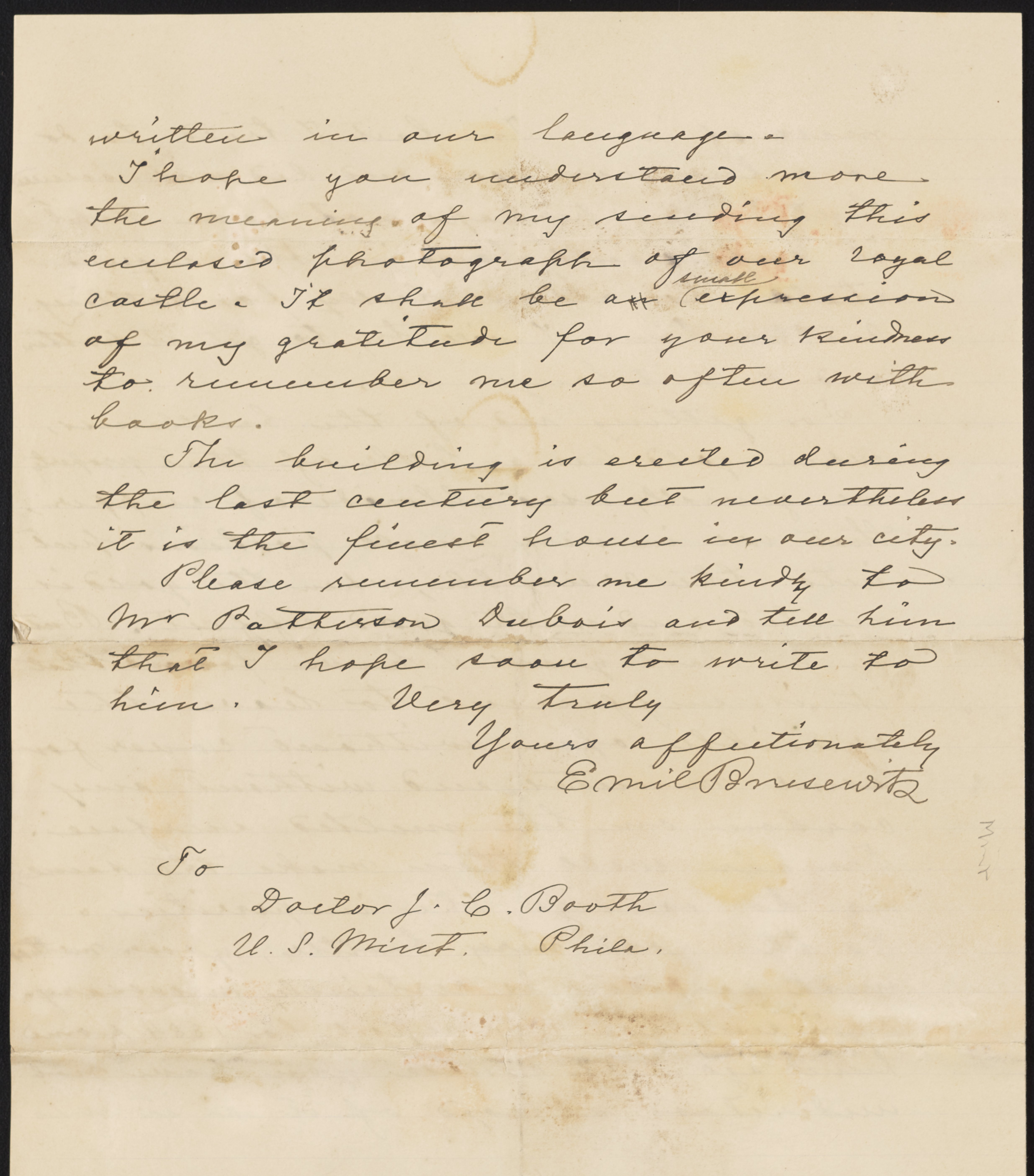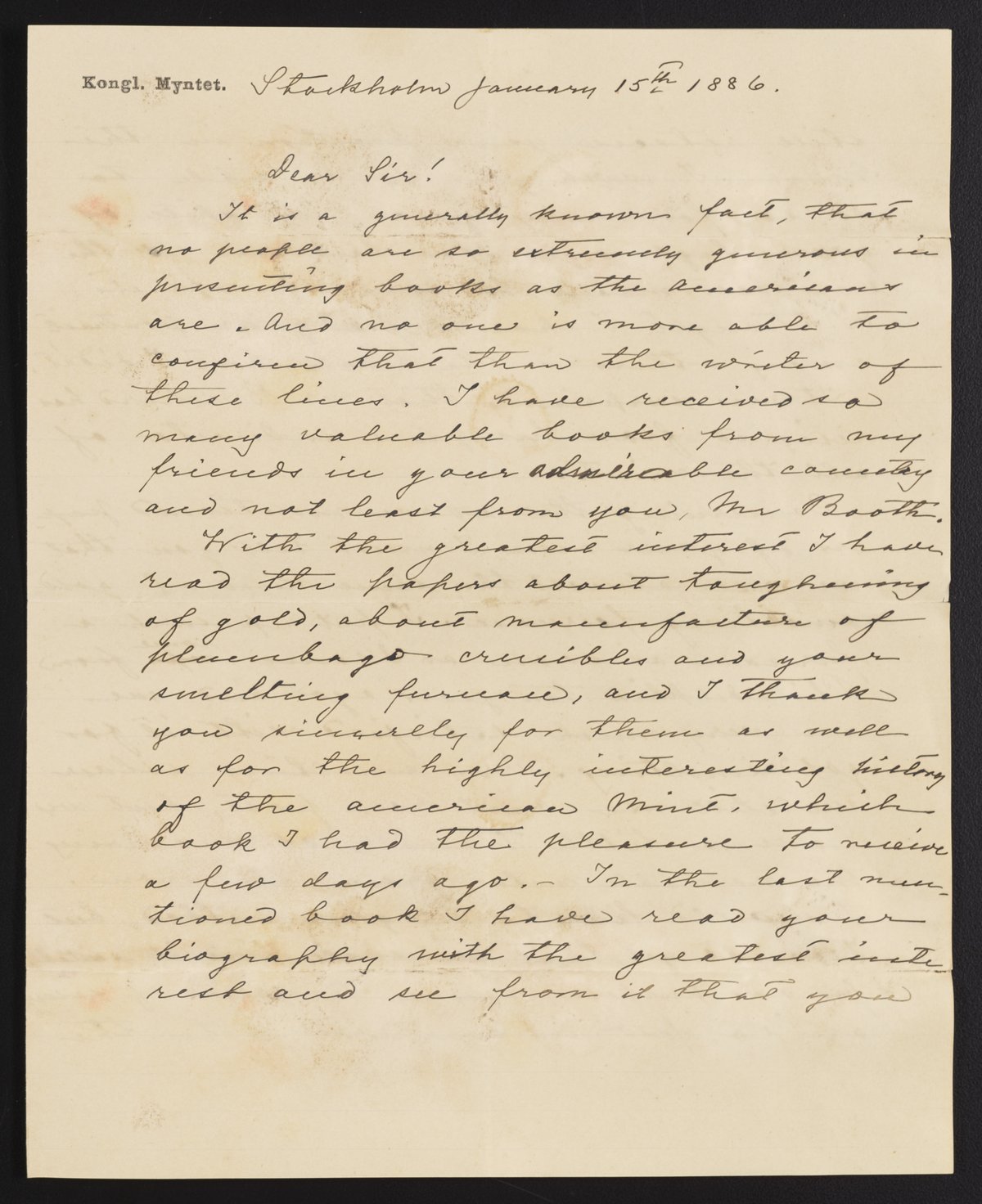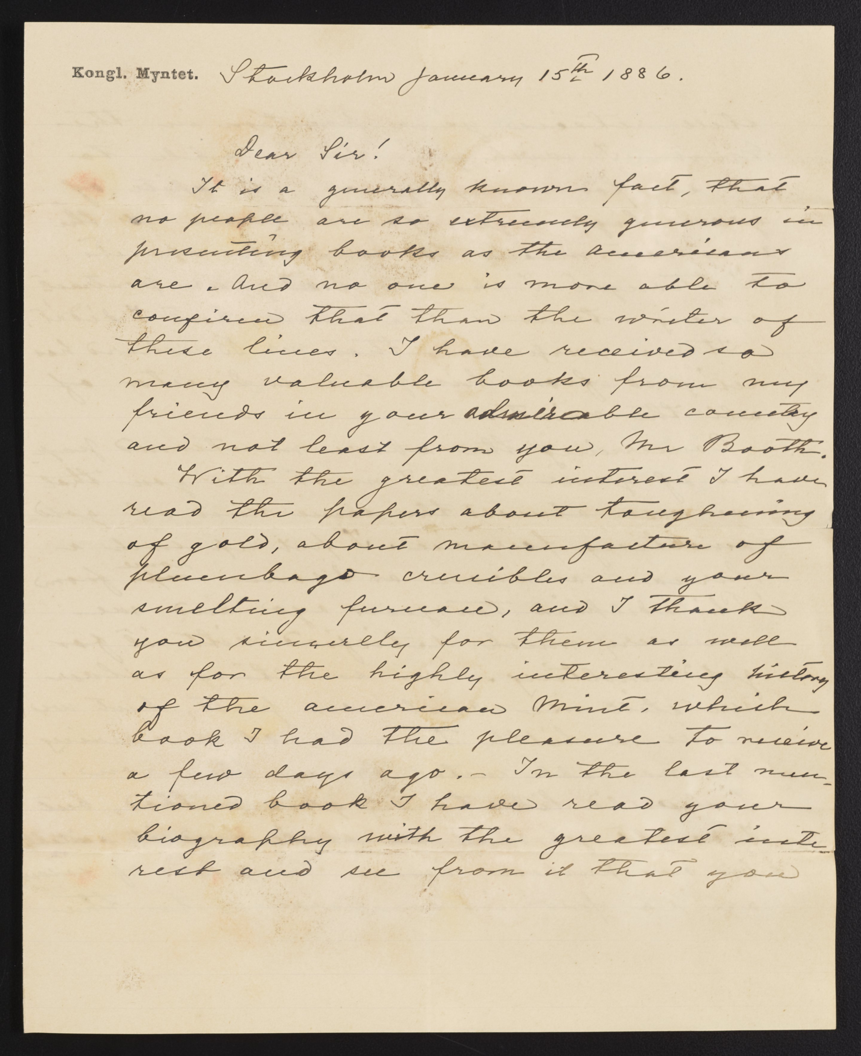 Small JPG1200 x 1472px — 227 KBLarge JPG2880 x 3533px — 868 KBFull-sized JPG5134 x 6298px — 2.0 MBOriginal fileTIFF — 5134 x 6298px — 92.6 MBEmil Brusewitz, a Swedish smelter, writes to James Curtis Booth (1810-1888) to discuss smelting techniques. Brusewitz thanks Booth for A History of the United States Mint and sends him a photograph of the Swedish royal palace as a gift. Photograph is not included in this collection.