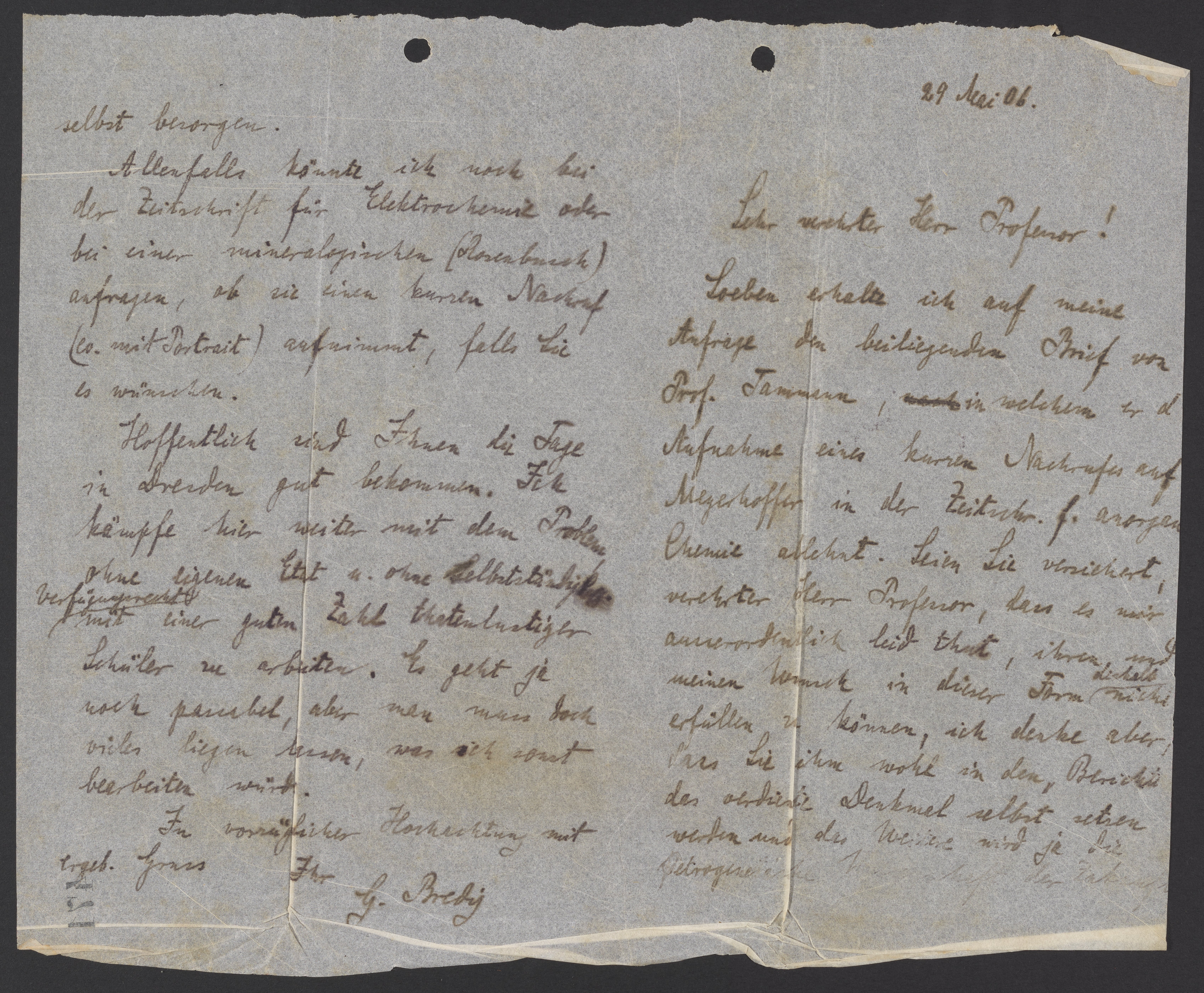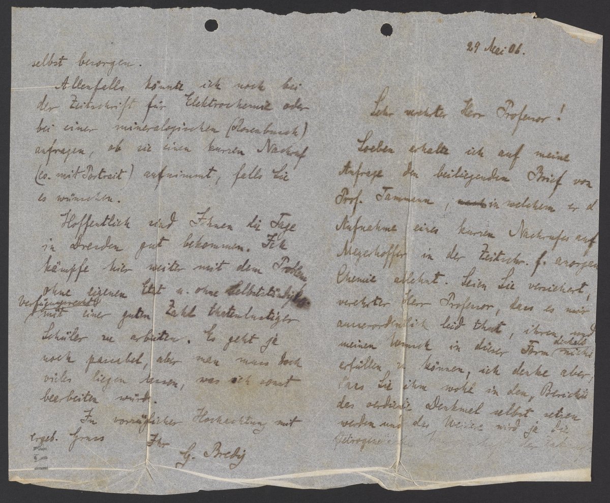 Soeben erhalte ich auf meine Anfrage den beiliegenden Brief von Prof. Tammann, in welchem er die Aufnahme eines kurzen Nachrufes auf Meyerhoffer in der Zeitschr. f. anorganische Chemie ablehnt. Seien Sie versichert, verehrter Herr Professor, dass es mir ausserordentlich leid thut, ihren und meinen Vermerk in dieser Form deshalb nicht erfüllen zu können, ich denke aber, dass Sie ihm wohl in den Bericht das verdiente Denkmal selbst setzten werden und das Weitere wird ja die ------- selbst besorgen.