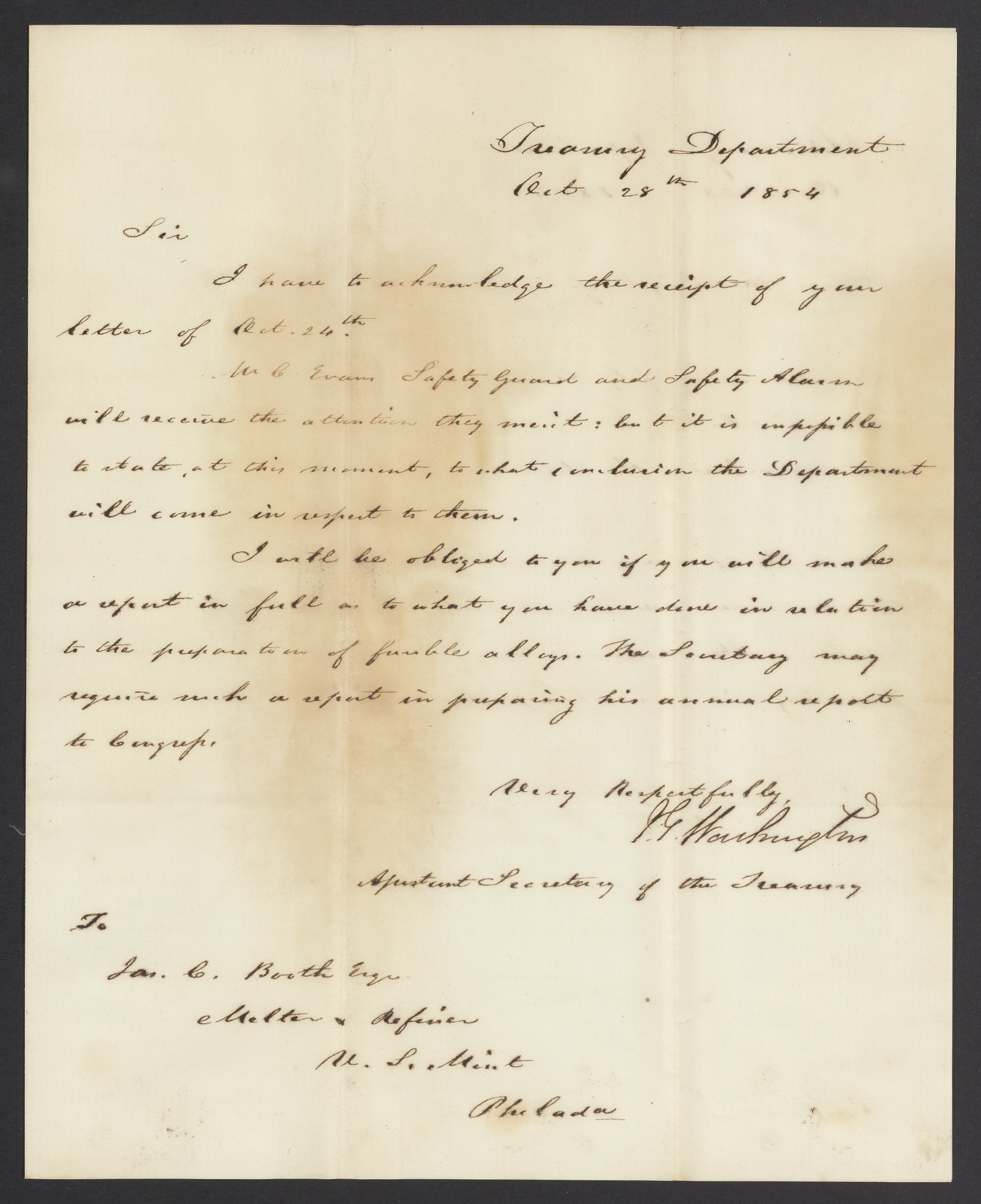 Letter from J. G. Washington to James Curtis Booth, October 28, 1854