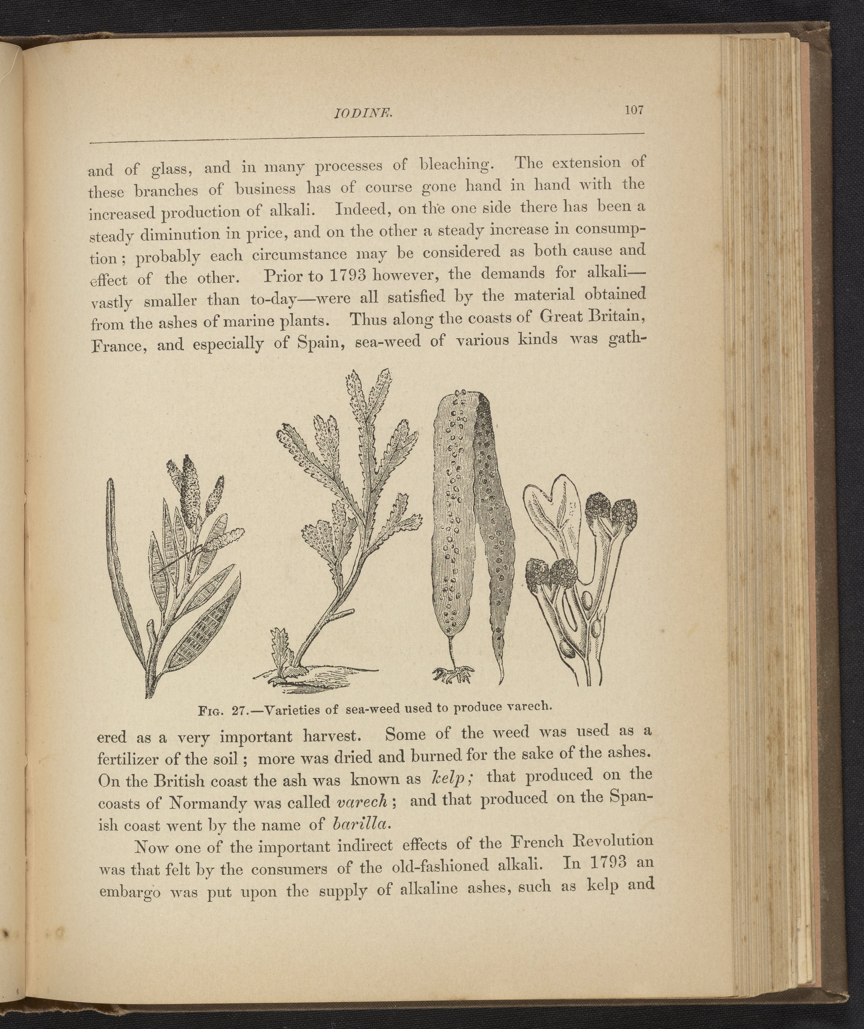 Black and white illustration depicting several varieties of sea-weed used to produce varech, also known as kelp. The accompanying text describes various applications of sea-weed, including as a fertilizer and source of alkali.
