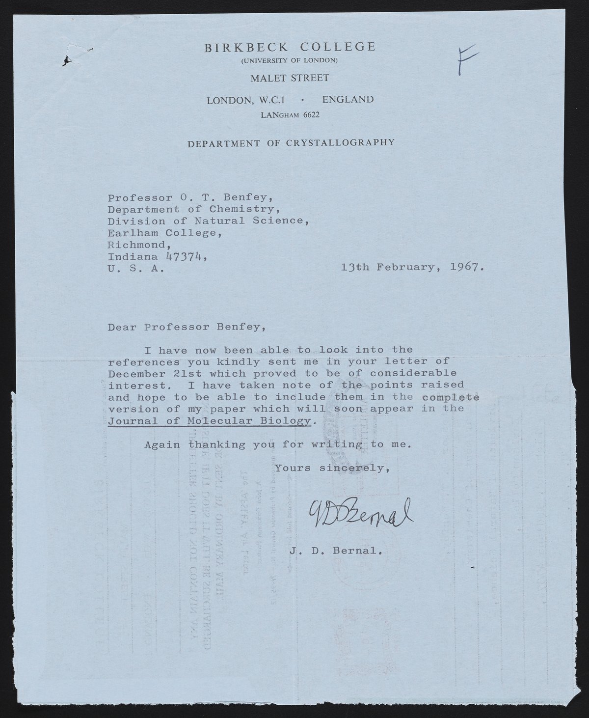 Letter from John D. Bernal to Theodor Benfey