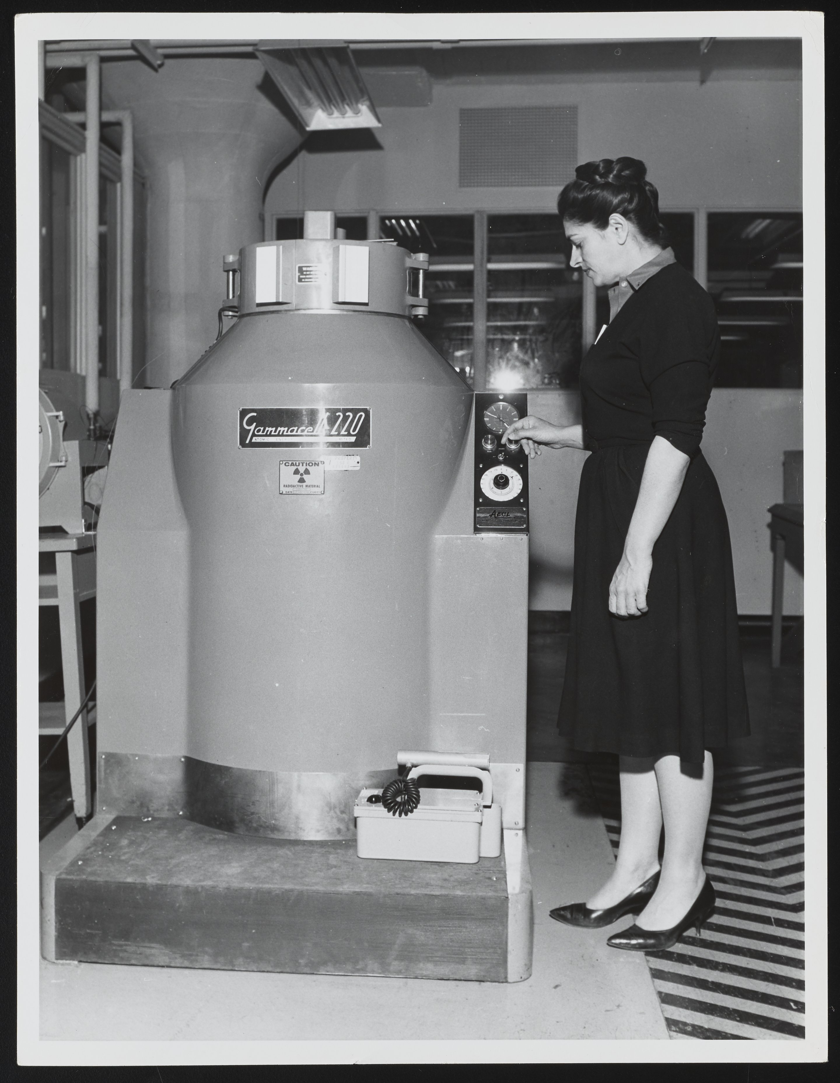 United States. Navy. “Eleanor Vadala with Gammacell 220 at the Naval Air Material Center,” circa 1958. Photographs from the Papers of J. Hartley Bowen, Box 1. Science History Institute. Philadelphia. https://digital.sciencehistory.org/works/3n203z18c.
