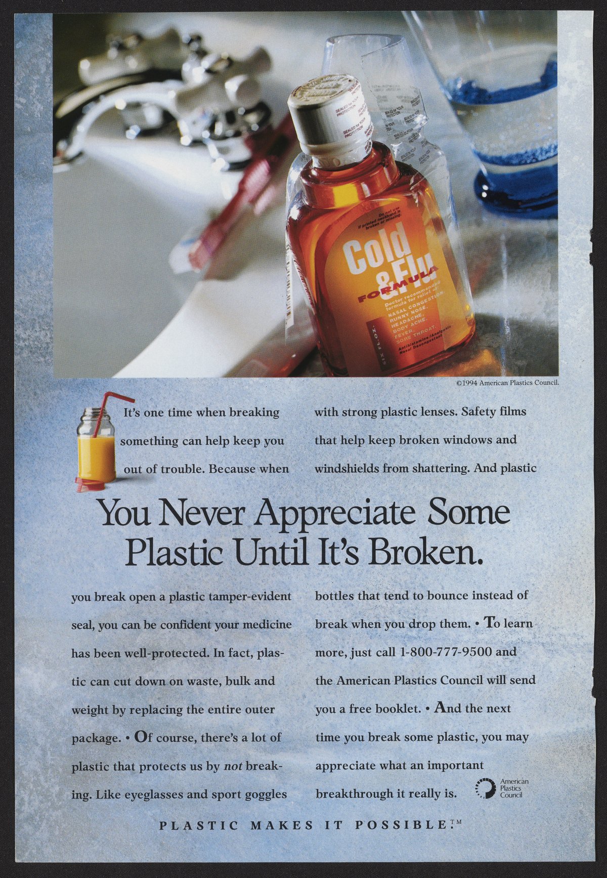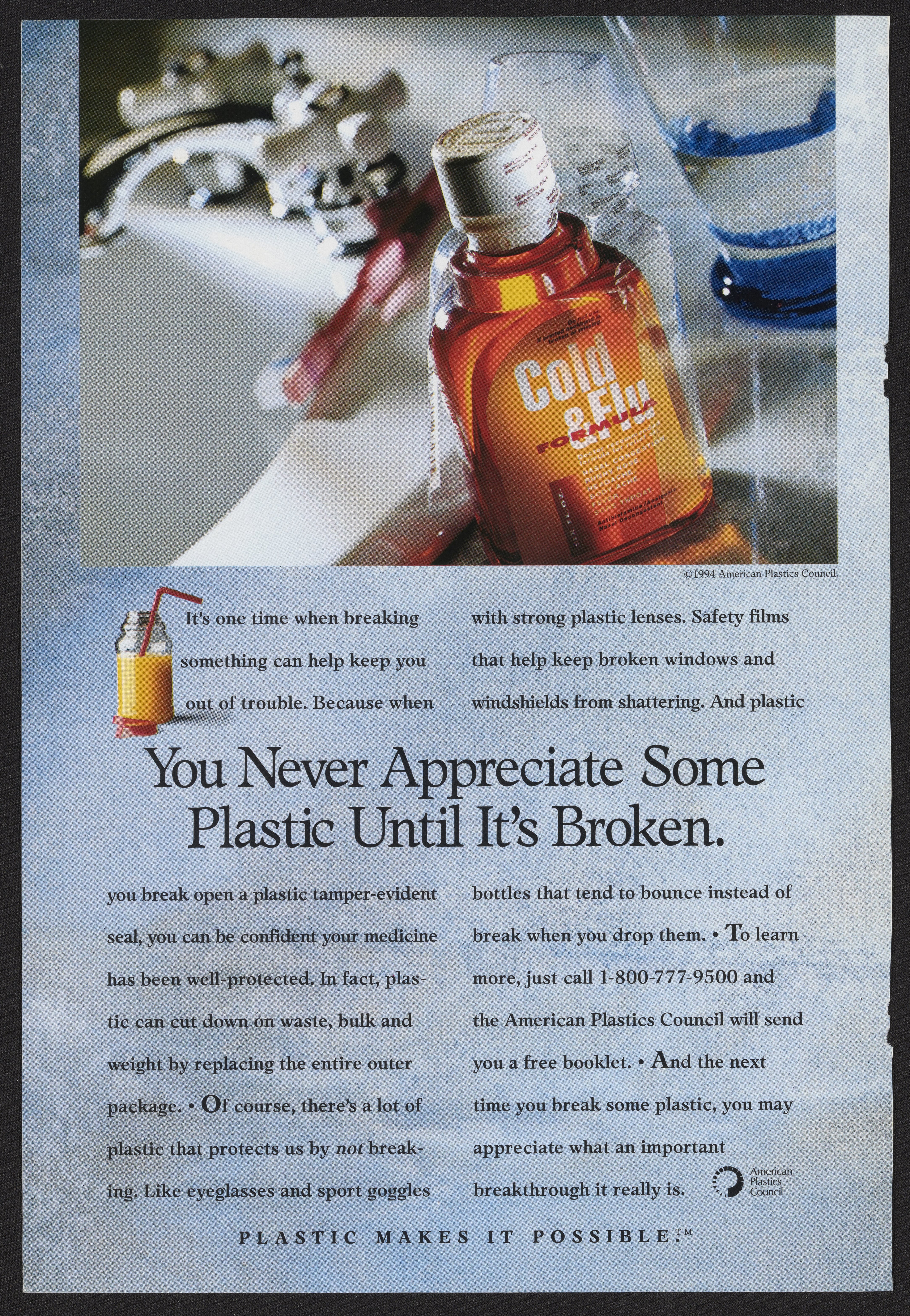 American Plastics Council. “Plastic Makes It Possible Advertisement, 1994,” 1994. Science History Institute. Philadelphia. https://digital.sciencehistory.org/works/3nt76fm.