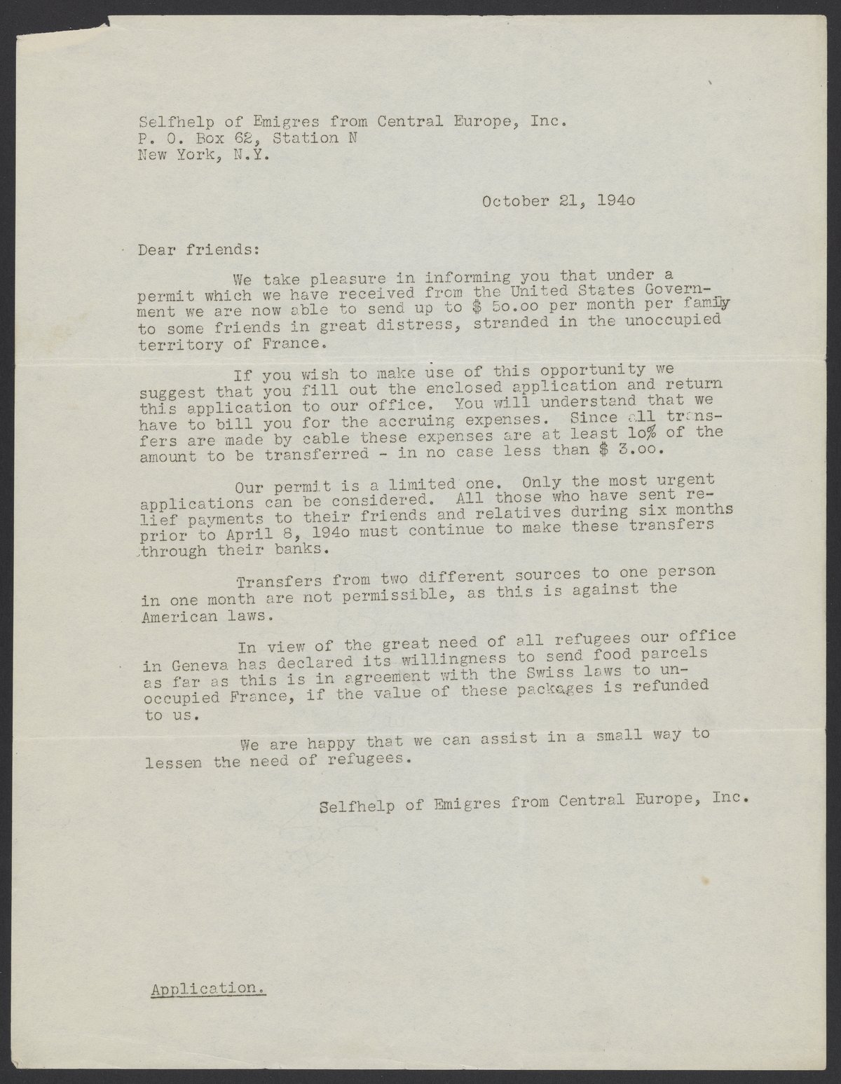 Letter from Selfhelp of Emigres from Central Europe, informing members that they can now send up to fifty U.S. dollars per month to refugees in France.