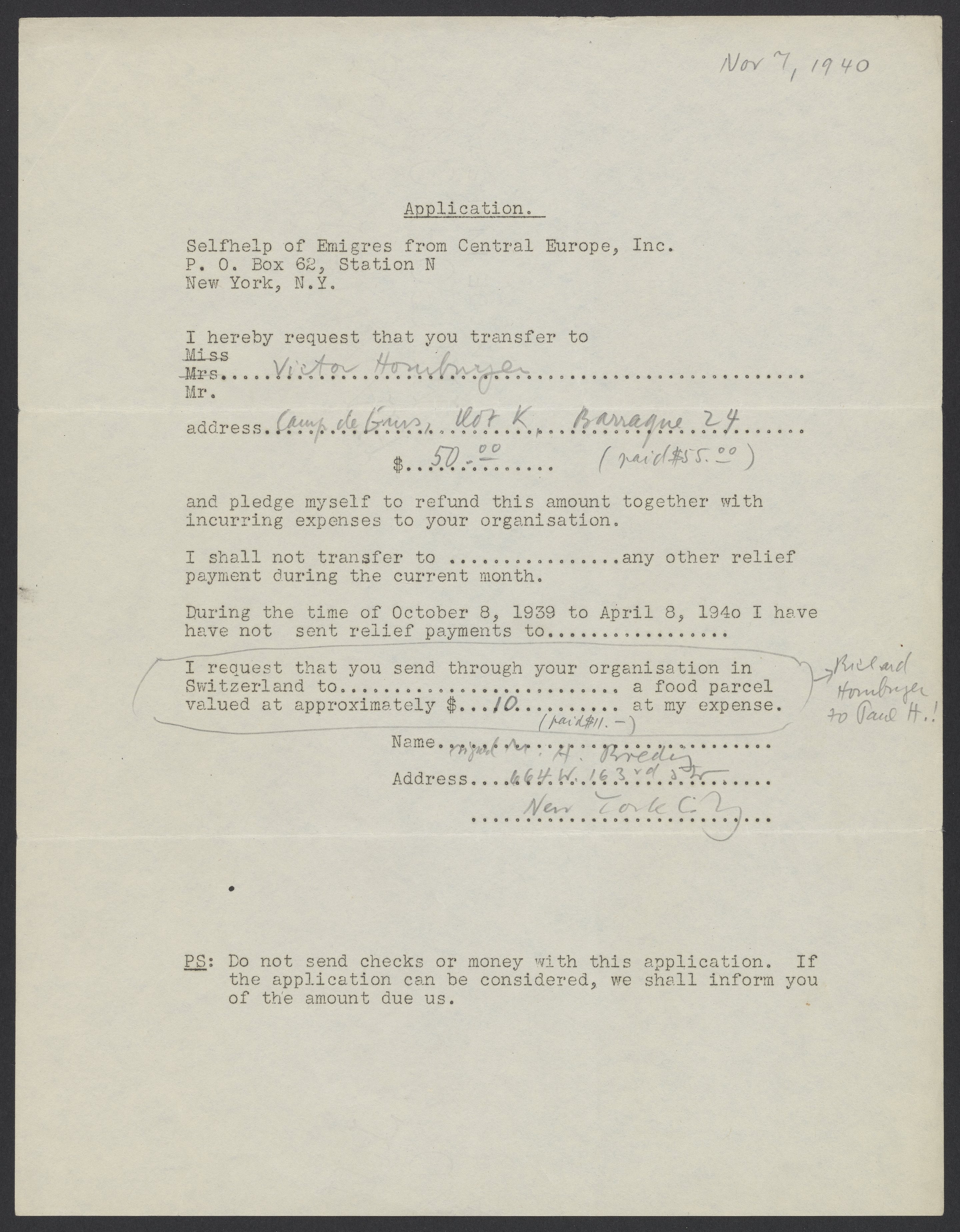Letter from Selfhelp of Emigres from Central Europe, October 21, 1940