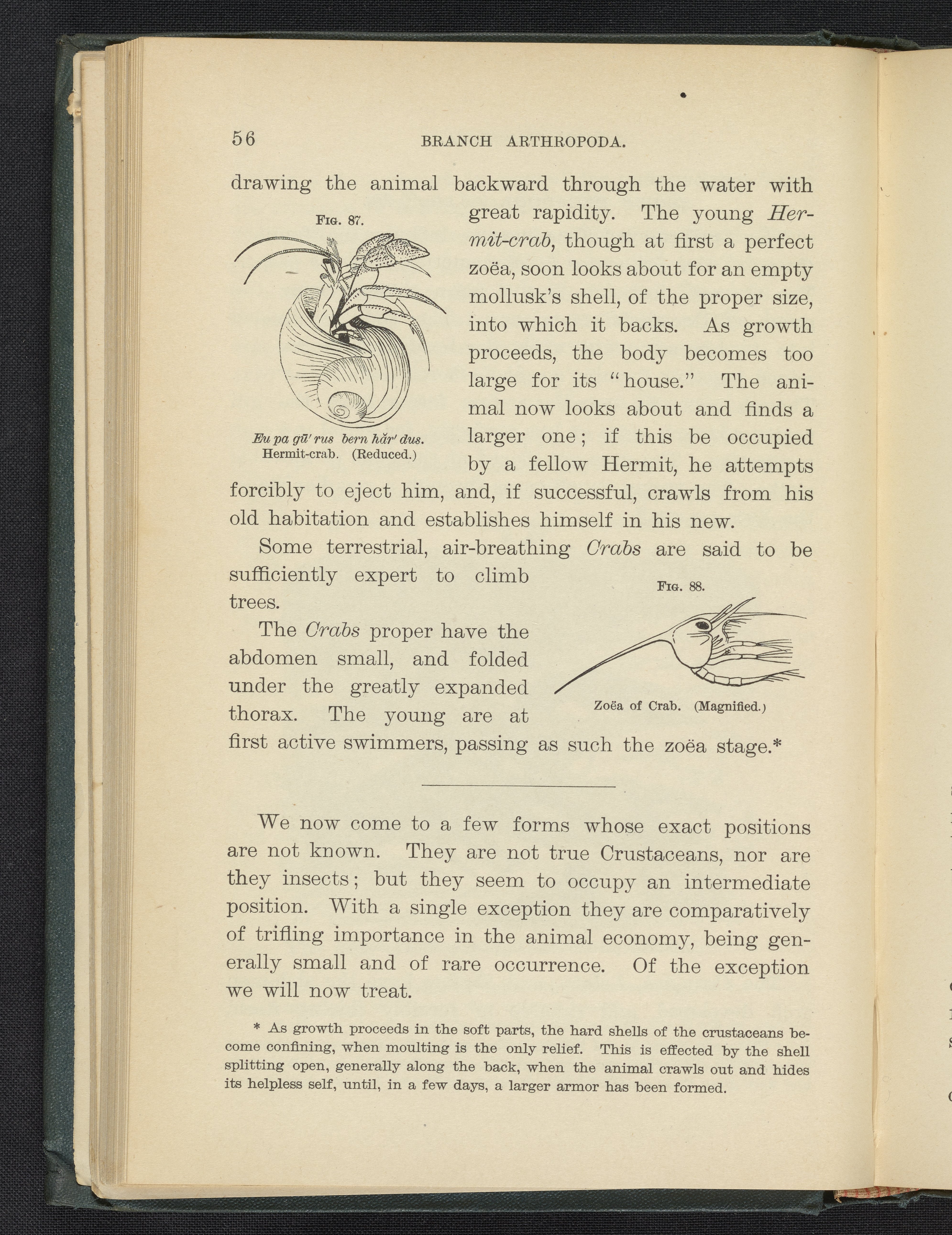 Steele, Joel Dorman, and Jenks, J. W. P. (John Whipple Potter). “Figure 87. Hermit-Crab (Reduced). Figure 88. Zoea of Crab (Magnified).” Popular Zoology. New York, New York: Chautauqua Press, 1887. https://digital.sciencehistory.org/works/3ojr7gs.