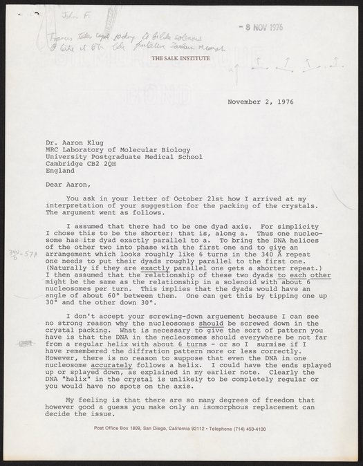 Crick, Francis. “Letter from Francis Crick to Aaron Klug, November 2, 1976,” November 2, 1976. History of Molecular Biology Collection, Box 19, Folder 25. Science History Institute. Philadelphia. https://digital.sciencehistory.org/works/3oo8zev.
