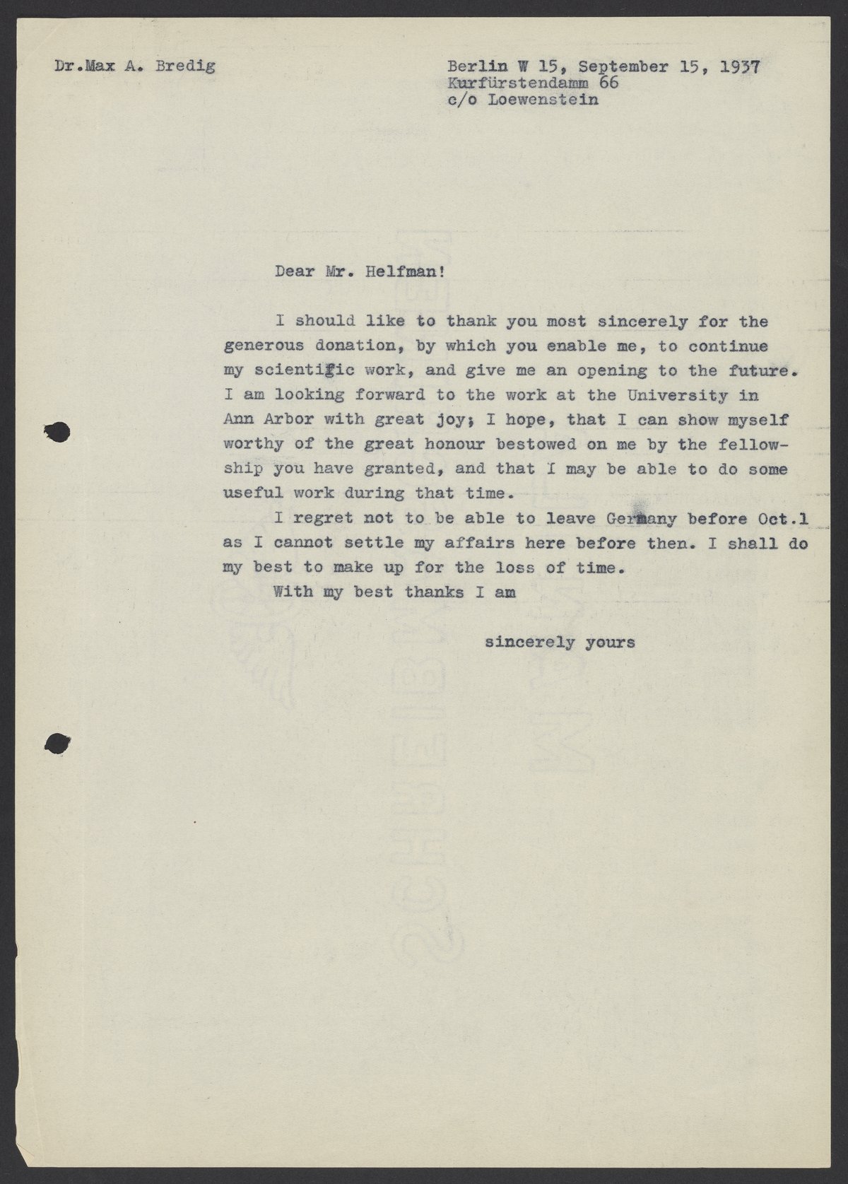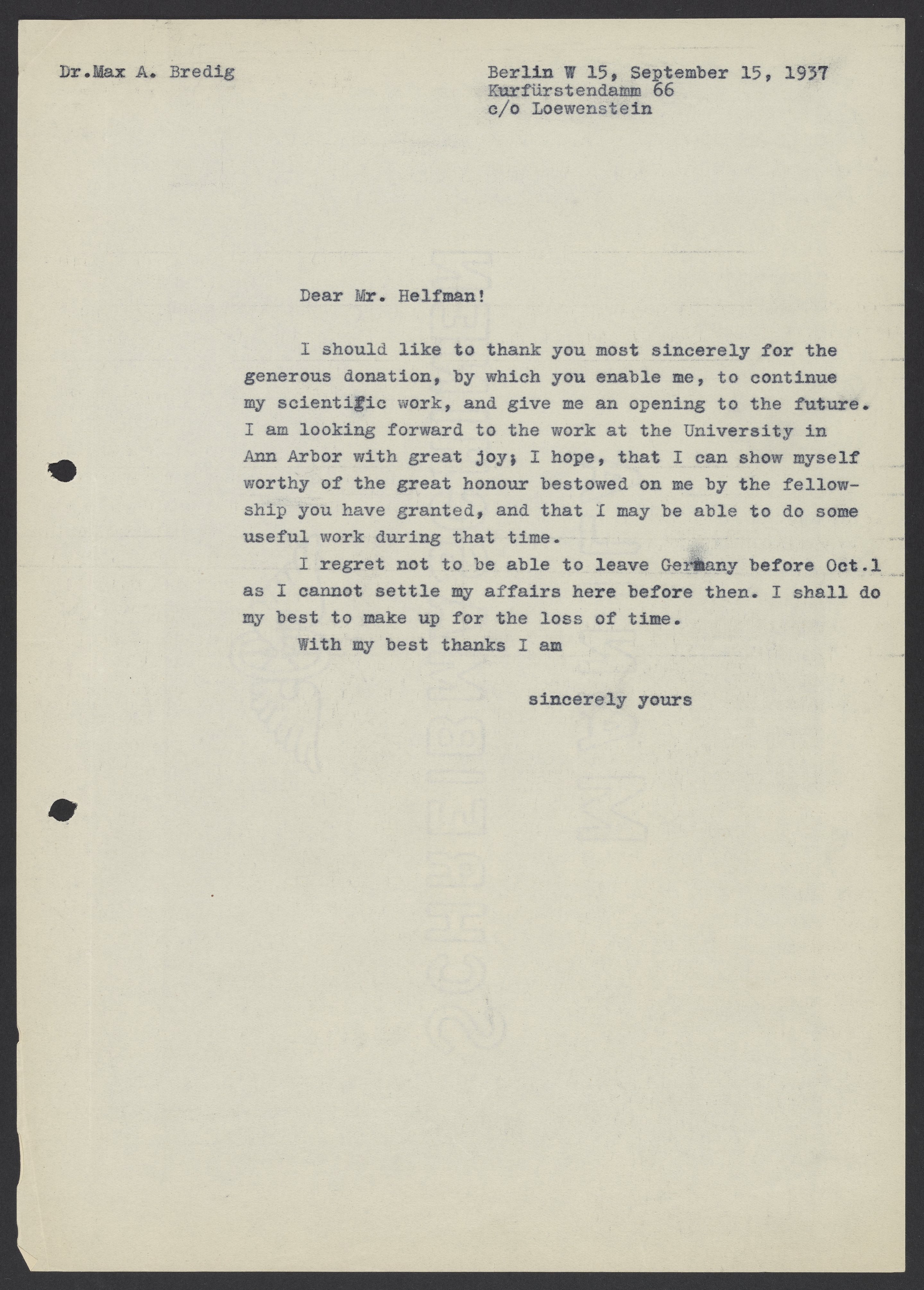 Max Albert Bredig (1902-1977) thanks Mr. Helfman for the financial support he has recently given him. Helfman seems to have been an integral part in giving Bredig the fellowship at the University of Michigan, which allowed him to emigrate from Germany before World War II.