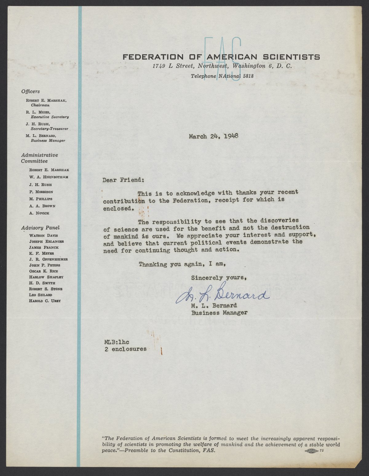 Letter from the Federation of American Scientists to Max Bredig, March 24, 1948