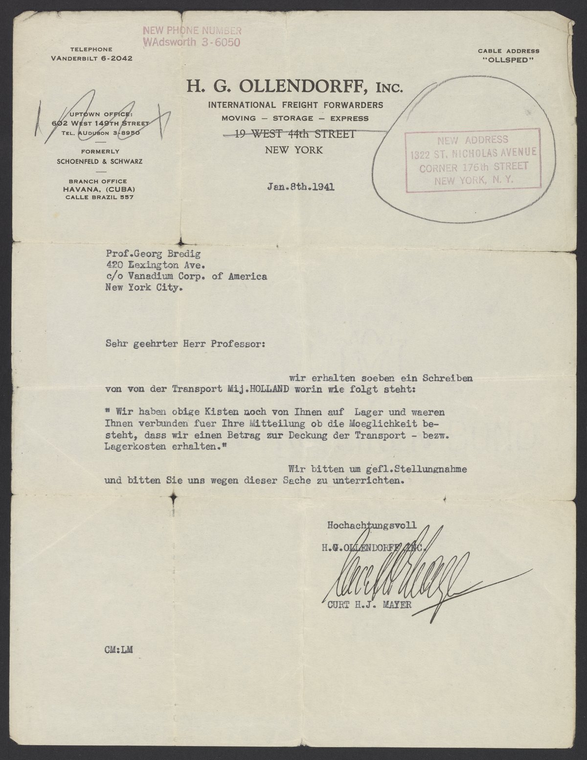 Letter to Georg Bredig (1868-1944) from Curt H.J. Mayer of H.G. Ollendorff Inc. Mayer informs Bredig that they received a letter from a transport company requesting they pay for the transport and storage of boxes in his storage.